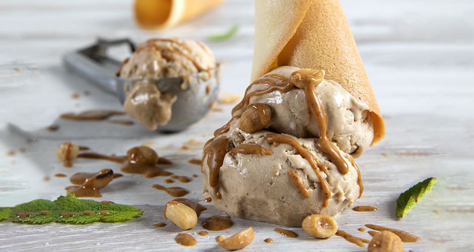 Μοιράζουμε το παγωτό σε χωνάκια, περιχύνουμε με λίγο από το φιστικοβούτυρο, πασπαλίζουμε με peanuts και σερβίρουμε, αν θέλουμε, με φύλλα μέντας.
