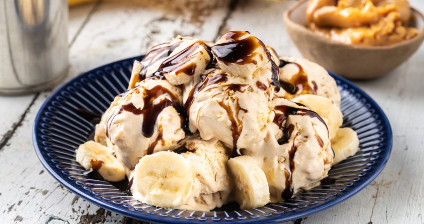 Σερβίρουμε το παγωτό banoffee με σιρόπι σοκολάτας.