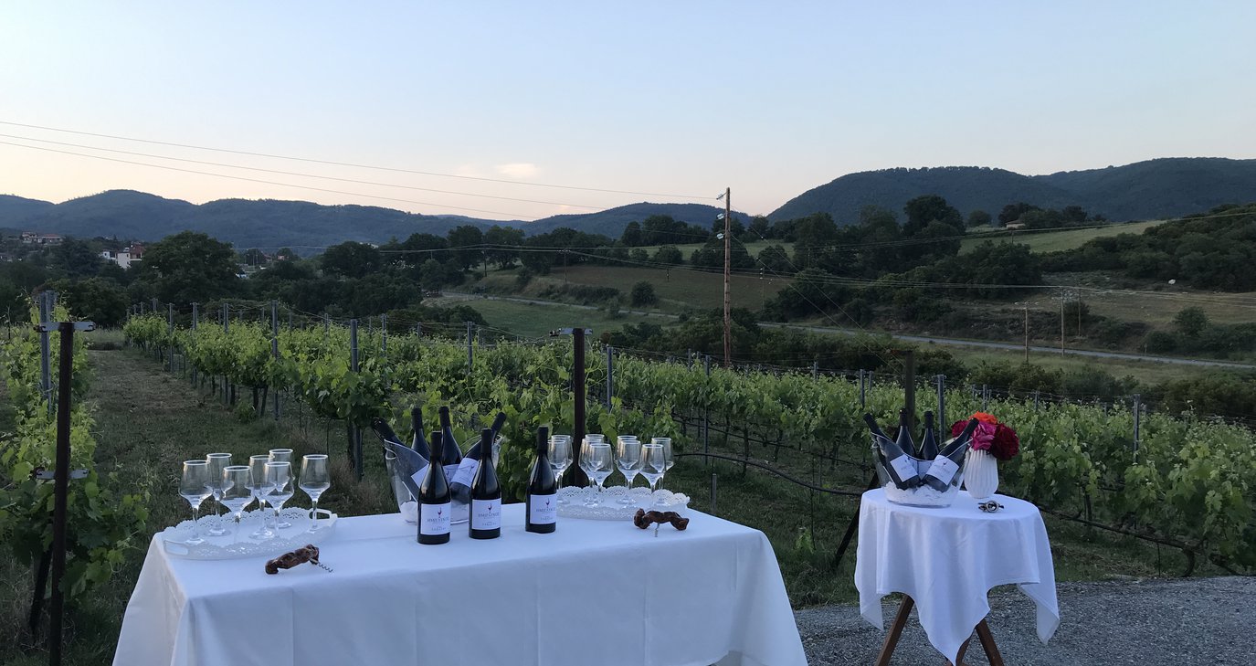 Ο κ. Δημήτρης, ο οδηγός μας, κατευθυνόταν προς το νεοσύστατο Κτήμα Ταραζά στη Μεγάλη Παναγιά. Ο Γιώργος και ο Διαμαντής μάς περίμεναν στην είσοδο με ένα ποτήρι ροζέ, από τα δικά τους, για να δοκιμάσουμε. Την ξενάγηση ανέβαλε ο Γιώργος, αφού ο Διαμαντής επέβλεπε τα κρέατα και τα λουκάνικα που έψηναν ήδη.