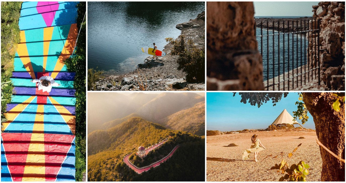 Πιο κάτω θα δεις το Κάστρο της Πάφου από ψηλά και το εσωτερικό του από ιδιαίτερες γωνιές, το Φράγμα Ξυλιάτου σαν χώρος για βόλτα με σανίδα, τις θαλάσσιες σπηλιές της Αγίας Νάπας σε μια λήψη από μέσα, το Θρωνί από ψηλά με τους κόκκινους δρόμους να ξεχωρίζουν ανάμεσα στο γύρω δάσος, την «Τέντα» της Καλαβασού να μοιάζει λες και βρίσκεται στη μέση του πουθενά και την πιο πρόσφατη προσθήκη, την πολύχρωμη σκάλα της Αγλαντζιάς σε drone λήψη.