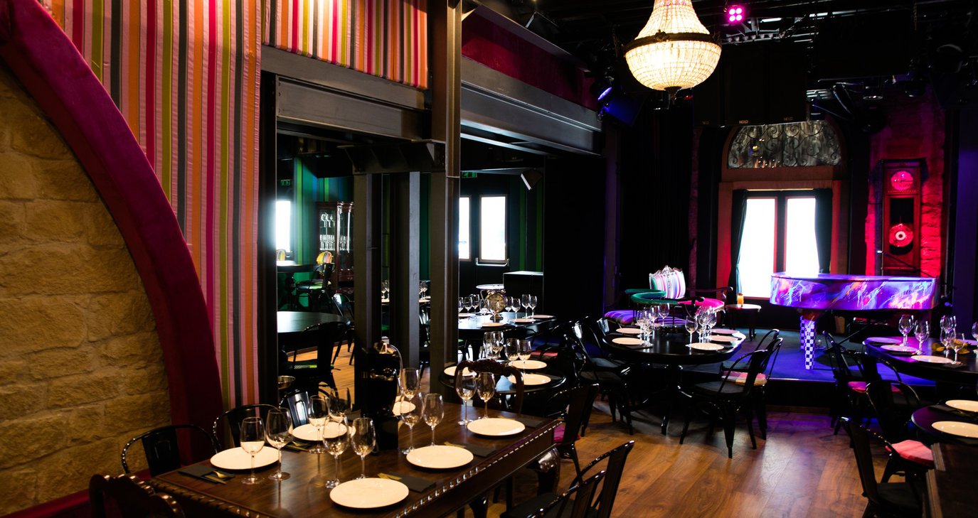 Ένας υπέροχος χώρος με vintage στοιχεία, ένα εντυπωσιακό πιάνο και μία μεγάλη τοιχογραφία με έντονα χρώματα.