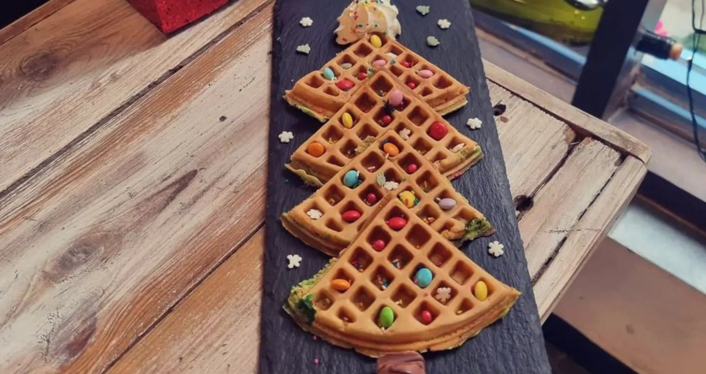 Πιο συγκεκριμένα, στα Λεύκαρα, στο Καφενείο της Παρέας, σερβίρουν βάφλες που σχηματίζουν δέντρο, με μπάρα Bueno σαν κορμό, πολύχρωμες σοκολάτες για στολίδια και whipped cream για κορυφή, με σιρόπι σοκολάτας σαν κορδέλες.