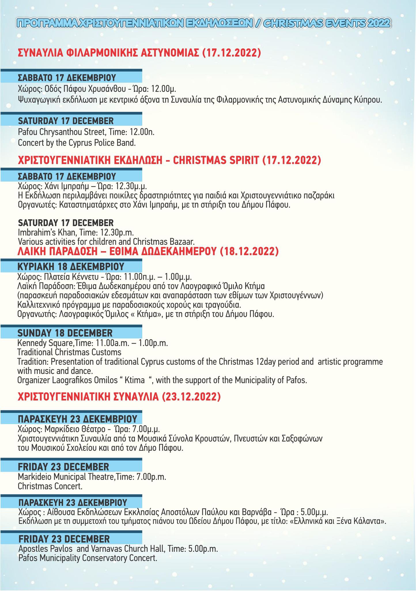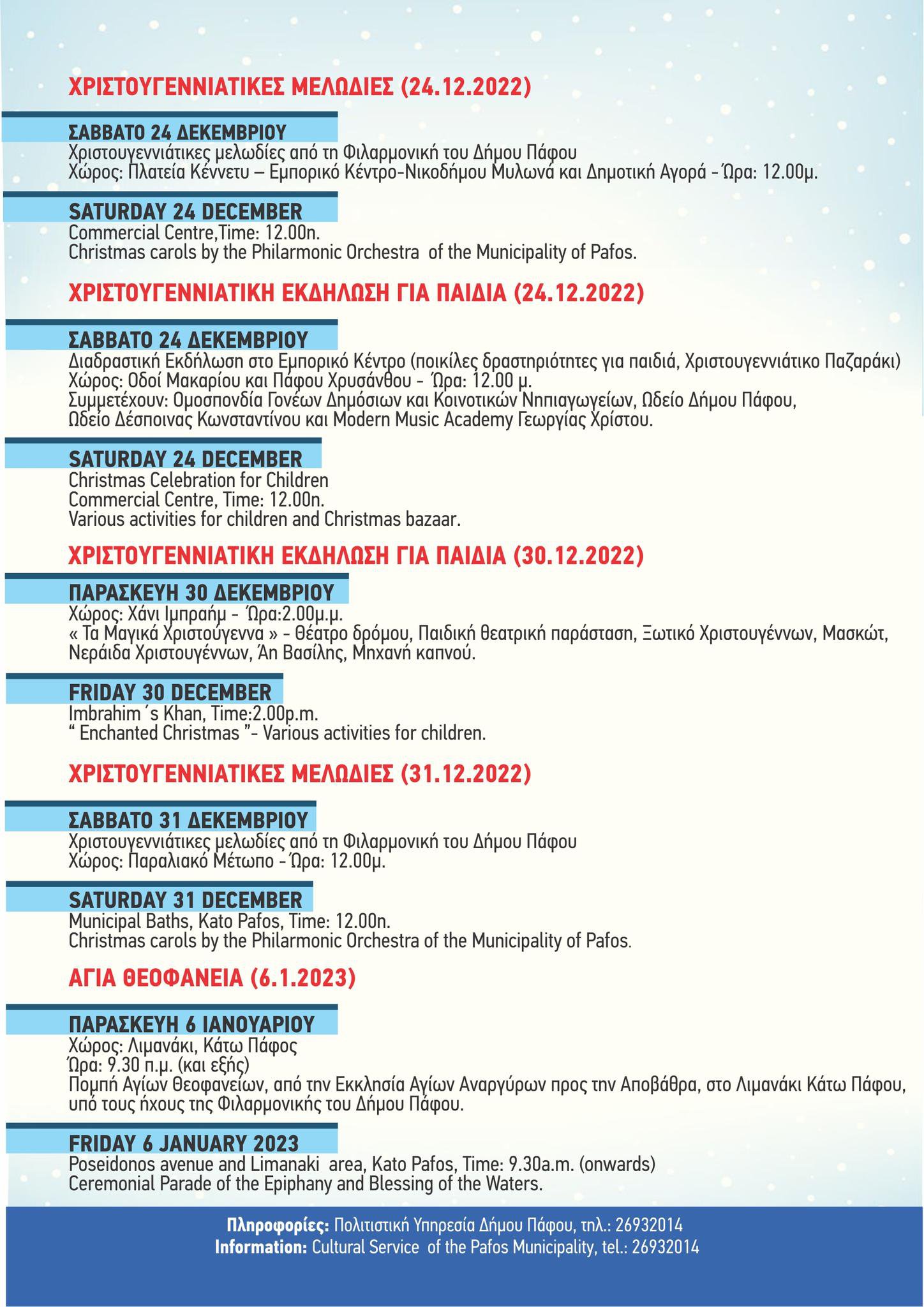 Ένα πλούσιο πρόγραμμα ετοίμασε ο Δήμος Πάφου για εμάς, το οποίο θα μας διασκεδάσει με μπόλικη μουσική, τραγούδι, κυνήγι θησαυρού, παζαράκι και άλλα πολλά για τις γιορτές των Χριστουγέννων μέχρι τις 6 Ιανουαρίου 2023.