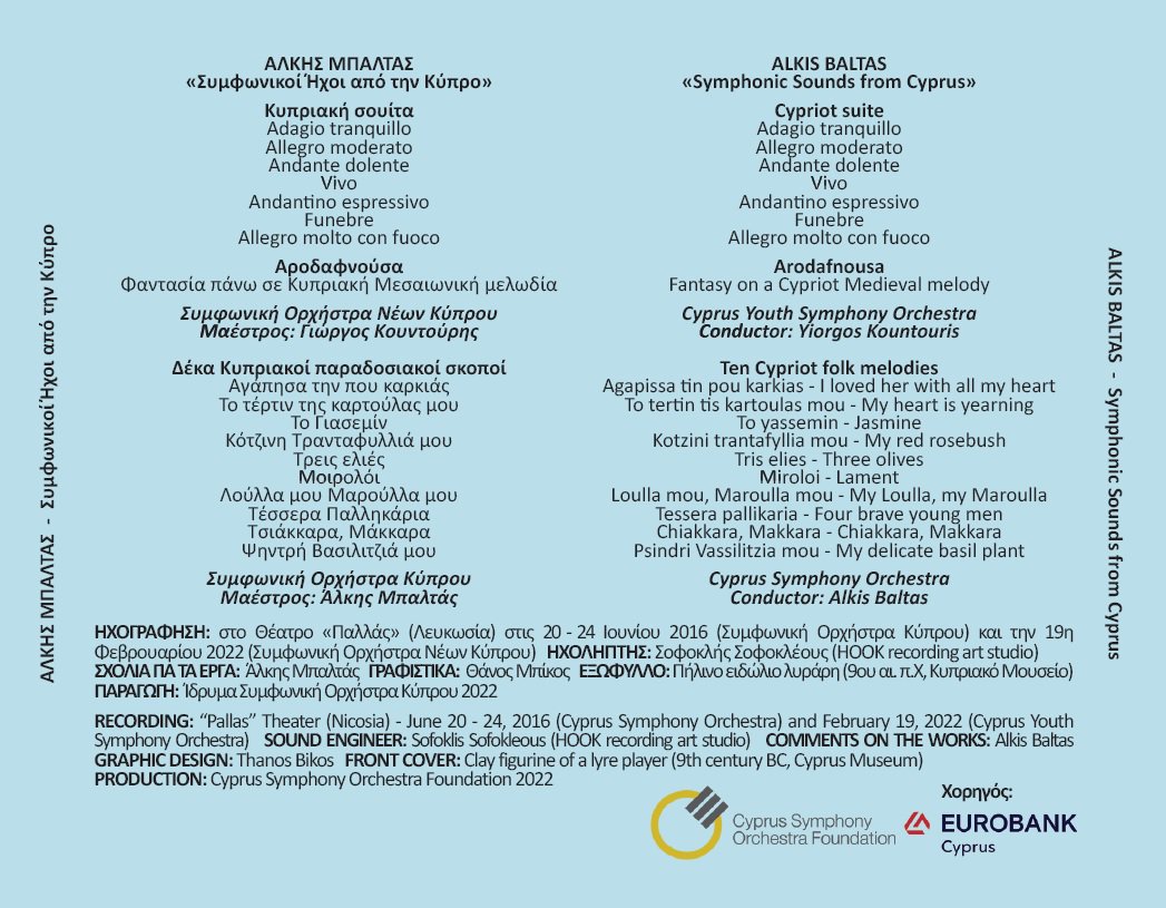 Το Ίδρυμα Συμφωνική Ορχήστρα Κύπρου ανακοινώνει με μεγάλη χαρά και ικανοποίηση την έκδοση του ψηφιακού δίσκου (CD) με τίτλο «Άλκης Μπαλτάς - Συμφωνικοί Ήχοι από την Κύπρο / Alkis Baltas – “Symphonic Sounds from Cyprus». Κύριος Χορηγός για τη δημιουργία του δίσκου η Eurobank, την οποία και ευχαριστούμε θερμά.