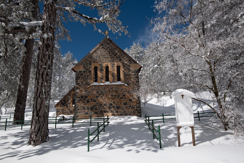 Βλέπουμε το εκκλησάκι του Αγίου Γεωργίου του Δάσους, βουνοπλαγιές και δέντρα καλυμμένα με κατάλευκο, καθαρό χιόνι, κάνοντας τις φωτογραφίες να μοιάζουν λες και τραβήχτηκαν σε κάποια άλλη Ευρωπαϊκή χώρα, απ' αυτές που βλέπουμε στα social media και θαυμάζουμε.