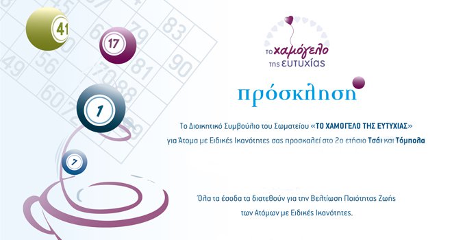 Ο Σύνδεσμος "Το Χαμόγελο της Ευτυχίας" για Άτομα με Ειδικές Ικανότητες διοργανώνει για δεύτερη φορά την ετήσια εκδήλωση "Τσάι και Τόμπολα" και μας καλεί να παίξουμε βοηθώντας συνάμα και τους συνανθρώπους μας που το έχουν ανάγκη. Όλα τα έσοδα θα διατεθούν για τη βελτίωση της ποιότητας ζωής των ατόμων με ειδικές ικανότητες. Η εκδήλωση τέλος, τελεί υπό την αιγίδα της συζύγου του Δημάρχου Ιδαλίου, Άντρης Καλλένου. Κυριακή 30 Μαρτίου, Κέντρο Ευκάλυπτοι, Δάλι, Λευκωσία, 16.00. Είσοδος €5.