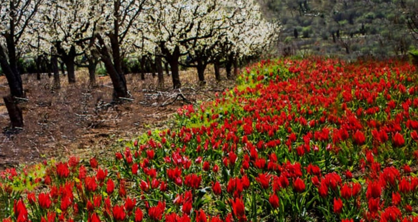 Οι ανθισμένες αμυγδαλιές συναντούν ένα κατακόκκινο λιβάδι από άγριες τουλίπες, δημιουργώντας ένα κάδρο που μοιάζει με πίνακα. Τη φωτογραφία ανέβασε η Μαρία Οικονομίδου στο γκρουπ Στο Νησί / On the island.