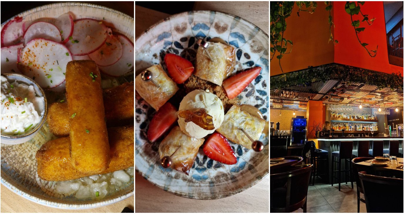 Το φαγητό ολοκληρώθηκε με επιδόρπιο, αφού δεν θα μπορούσαμε να φύγουμε χωρίς να δοκιμάσουμε κάτι γλυκό. Γλυκά rolls με ψημένη μπανάνα, λευκή σοκολάτα και μπισκότο, σε ένα πιάτο μαζί με θρυμματισμένο μπισκότο, φράουλες και παγωτό βανίλια σαν το πιο νόστιμο φινάλε μιας νέας γαστρονομικής εμπειρίας.