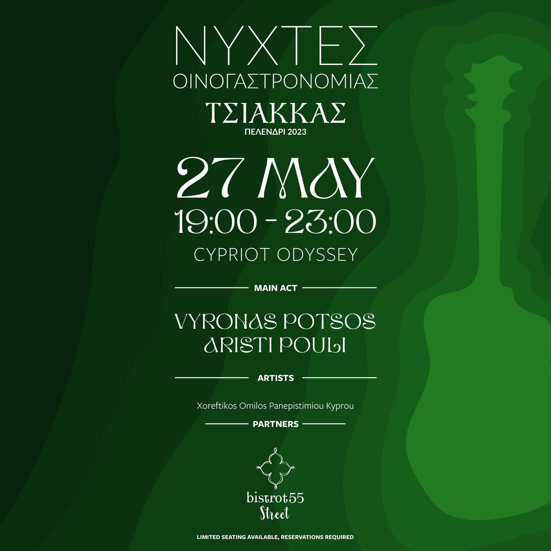 Το Οινοποιείο Τσιάκκας οργανώνει το Φεστιβάλ «Νύχτες Οινογαστρονομίας Μάιος 2023»! Πάμε για τρία βράδια Σαββάτου με υπέροχο κρασί, απολαυστικό φαγητό, ζωντανή μουσική, συνδυασμένα με την τέχνη και τον πολιτισμό.