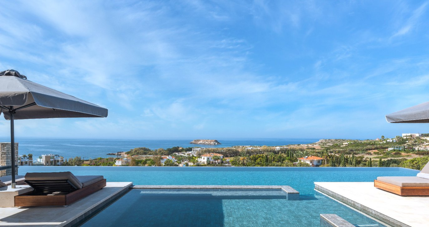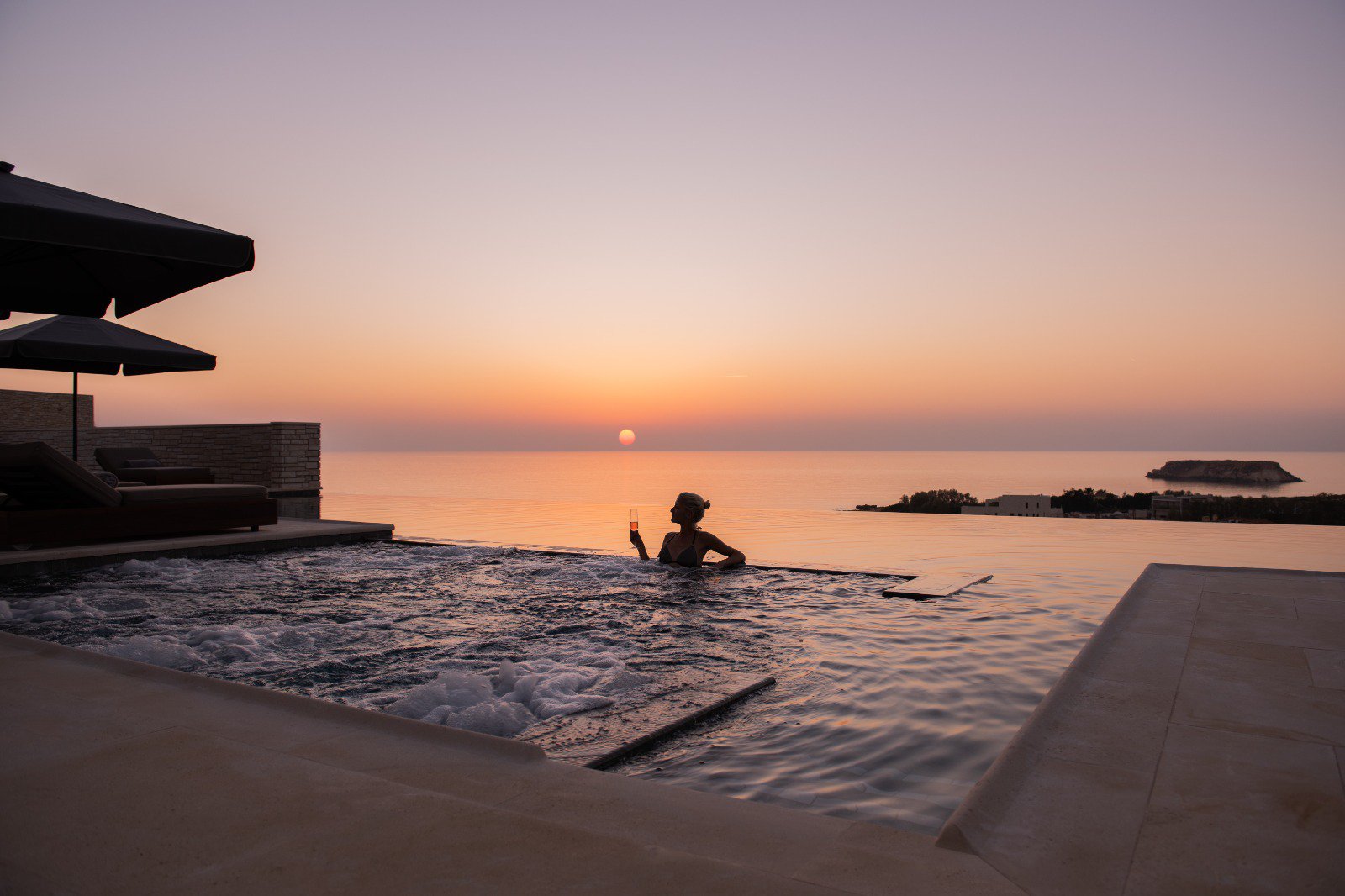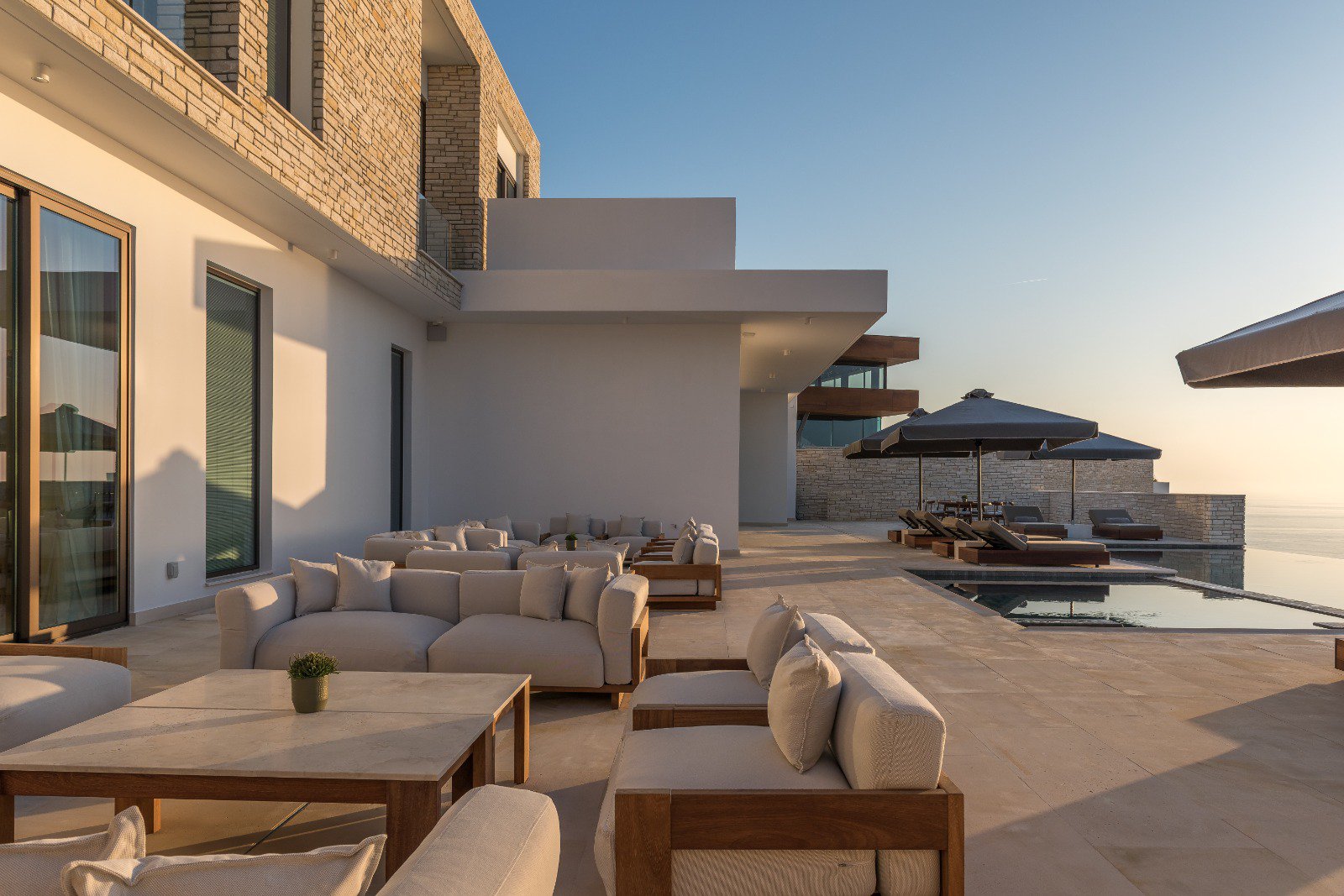 Οι επισκέπτες της μπορούν να απολαύσουν απαράμιλλη θέα στη θάλασσα από την ιδιωτική πισίνα υπερχείλισης (διαστάσεων 20m x 5m), ενσωματωμένο τζακούζι (6m x 4m) και μία μοναδική βεράντα που τη λούζει ο ήλιος, ενώ τα μεγάλα παράθυρα επιτρέπουν στο εκπληκτικό φυσικό φως να εισέλθει στη βίλα, δημιουργώντας μια απρόσκοπτη σύνδεση μεταξύ της εξωτερικής βεράντας και των πολυτελών, χαλαρωτικών εσωτερικών χώρων.
