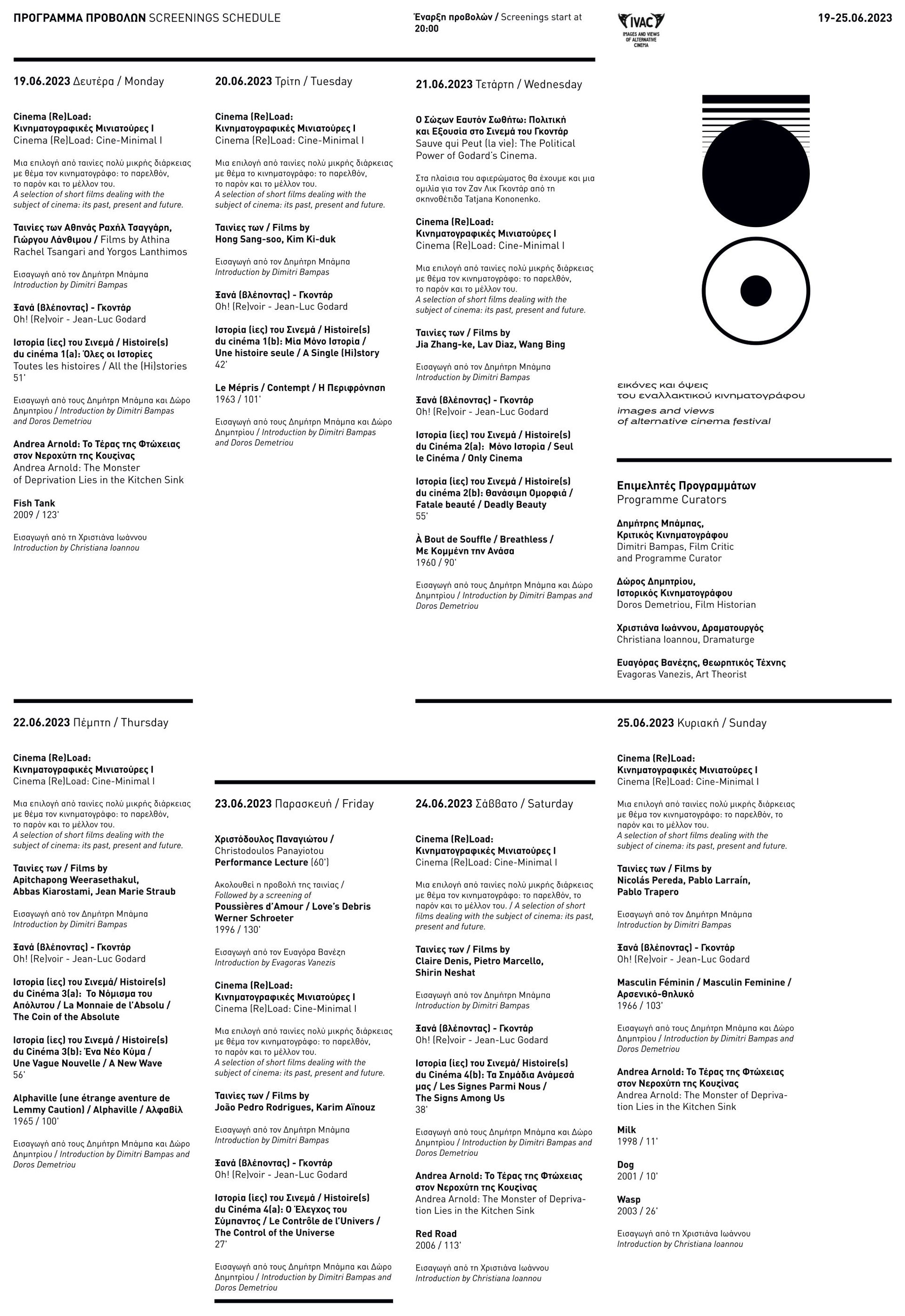 Αναλυτικά, το Φεστιβάλ «Εικόνες και Όψεις του Εναλλακτικού Κινηματογράφου» 2023 αποτελείται από τα ακόλουθα προγράμματα: