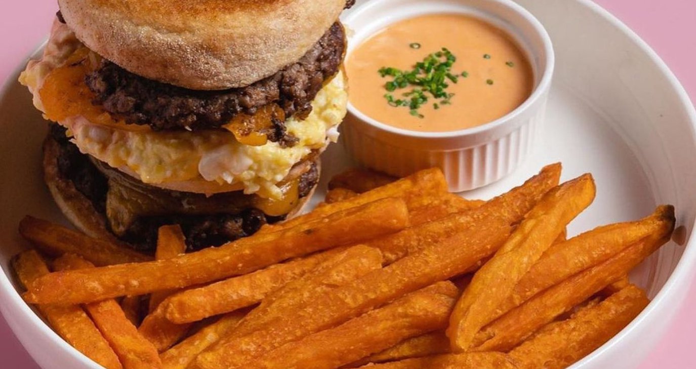Ανάμεσα στις νόστιμες επιλογές, συναντάμε ένα ιδιαίτερο burger, με μάφιν σαν ψωμάκια και ανάμεσα ζουμερό μπιφτέκι και αβγό. Στο πλάι, φρέσκιες γλυκοπατάτες για ολοκληρωμένη brunch εμπειρία.