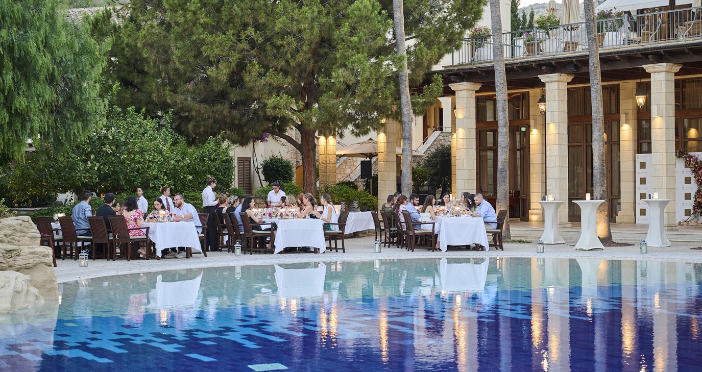 Το δείπνο έλαβε χώρα ανάμεσα στους αρωματικούς κήπους του ξενοδοχείου, κάτω από παστέλ χρωματισμούς και τον έναστρο καλοκαιρινό ουρανό διπλά από την αστραφτερή lagoon style πισίνα 80 μέτρων και τις πολυτελείς σουίτες που την περιτριγυρίζουν.