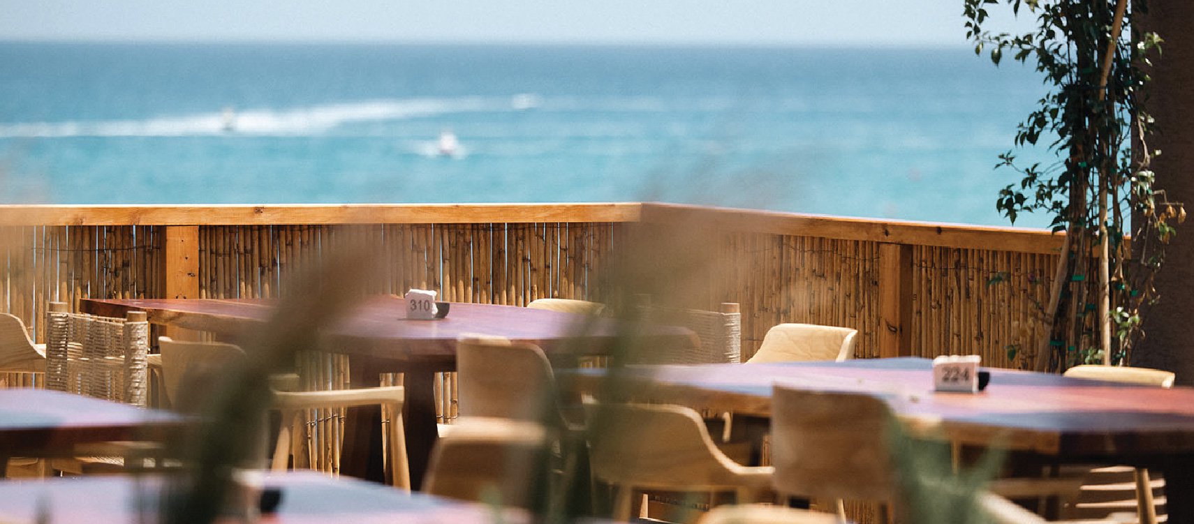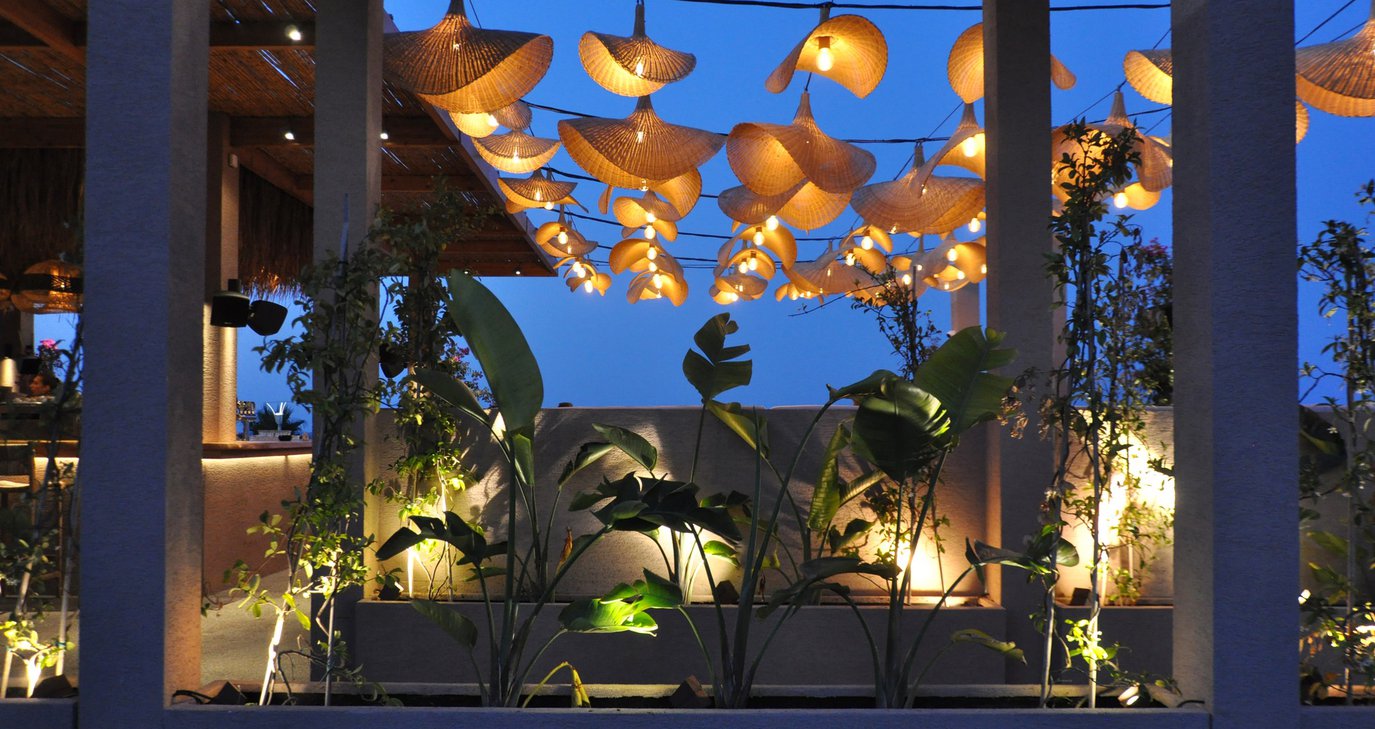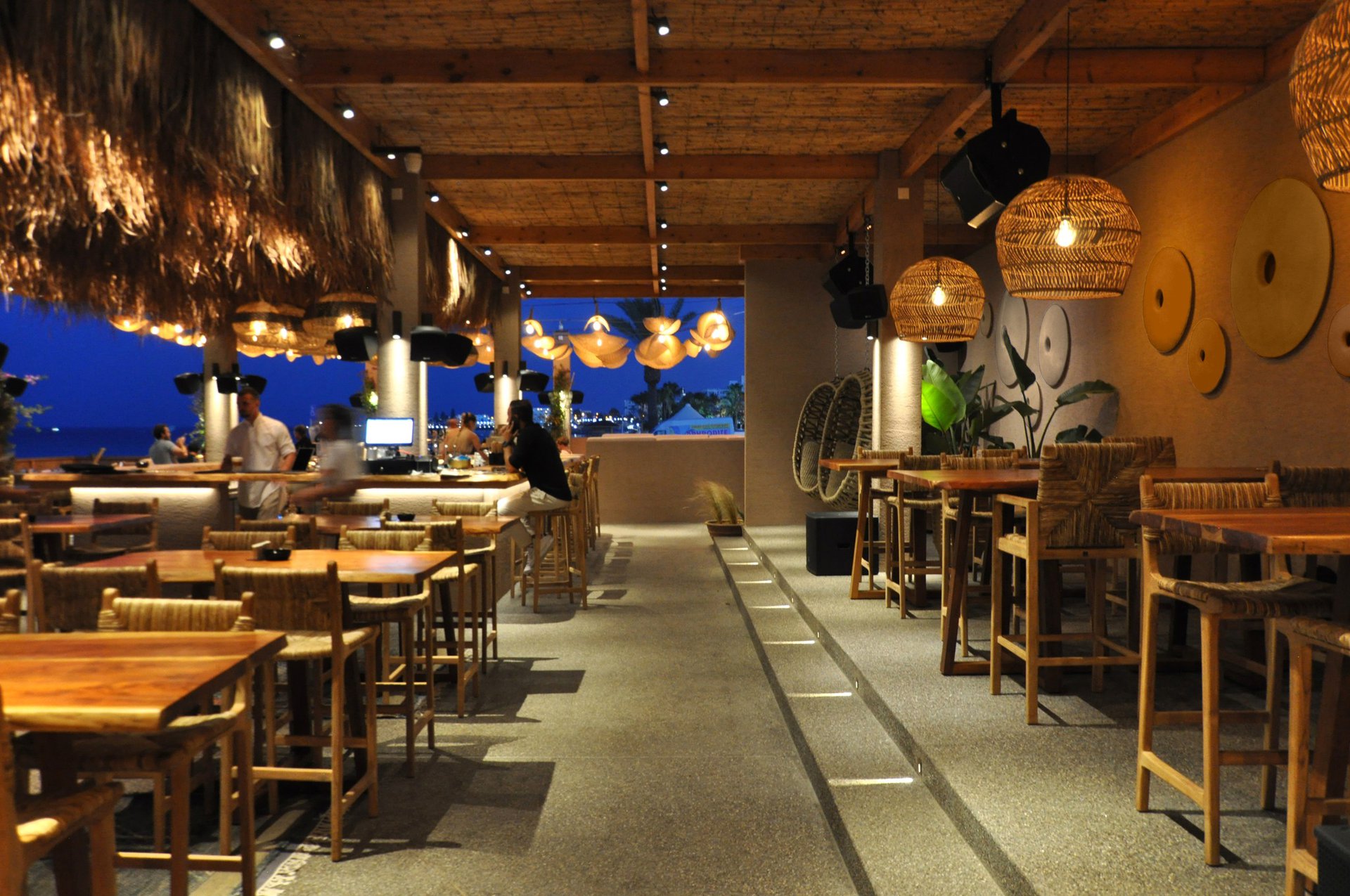 Στον χώρο, στον οποίο όλα κινούνται σε γήινες αποχρώσεις, ξεχωρίζουν τα κρεμαστά ψάθινα καπέλα, τα έπιπλα αλλά και το ξεχωριστό μπαρ που βρίσκεται στο κέντρο!