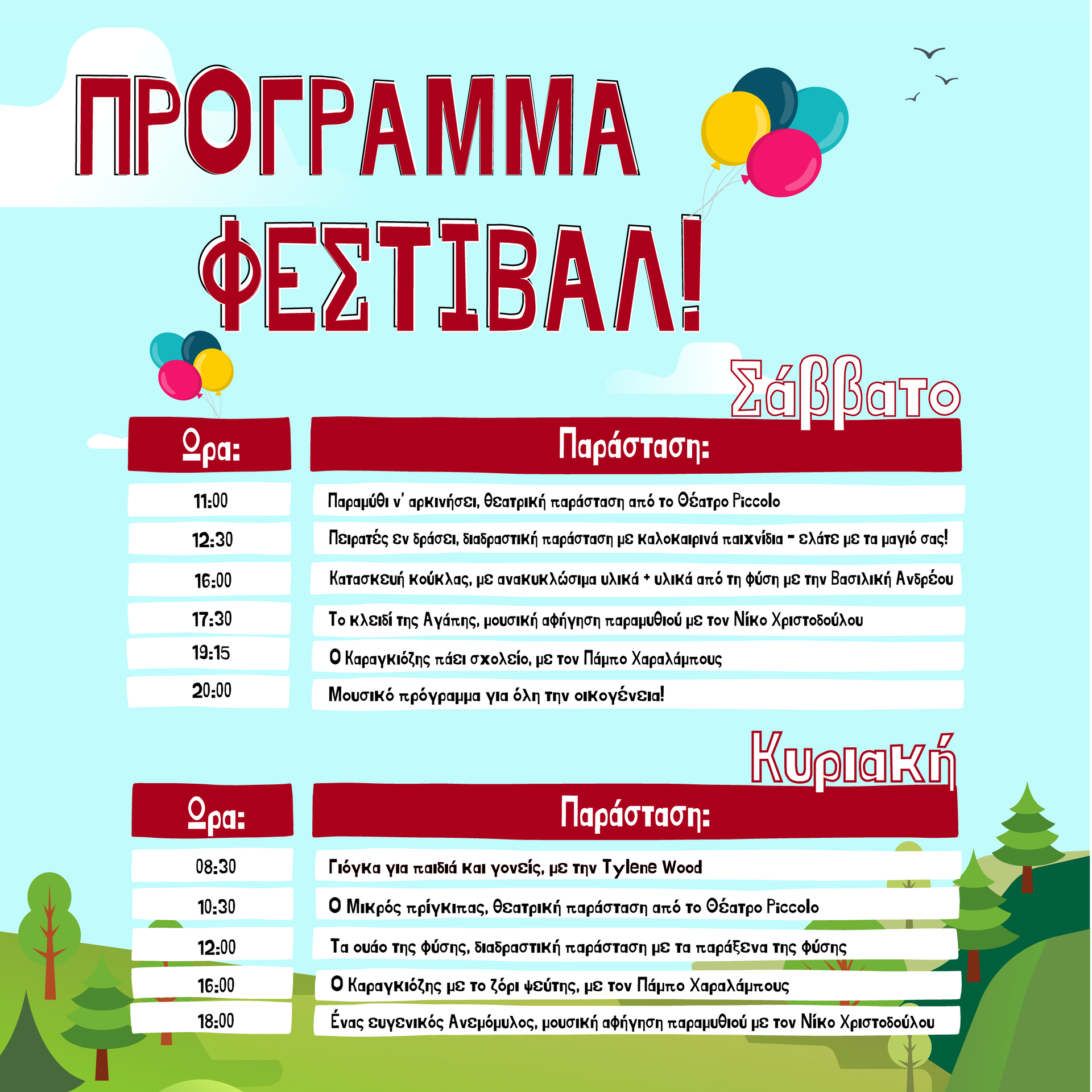 Δύο μέρες γεμάτες θέατρο, καραγκιόζη, διαδραστικές παραστάσεις, μουσικό παραμυθά, βιωματικά εργαστήρια στη φύση, κατασκευή κούκλας με φυσικά και ανακυκλώσιμα υλικά, γιόγκα για όλη την οικογένεια, γνωριμία με τα πιο παράξενα ζώα του πλανήτη, καλοκαιρινά παιχνίδια κ.ά.