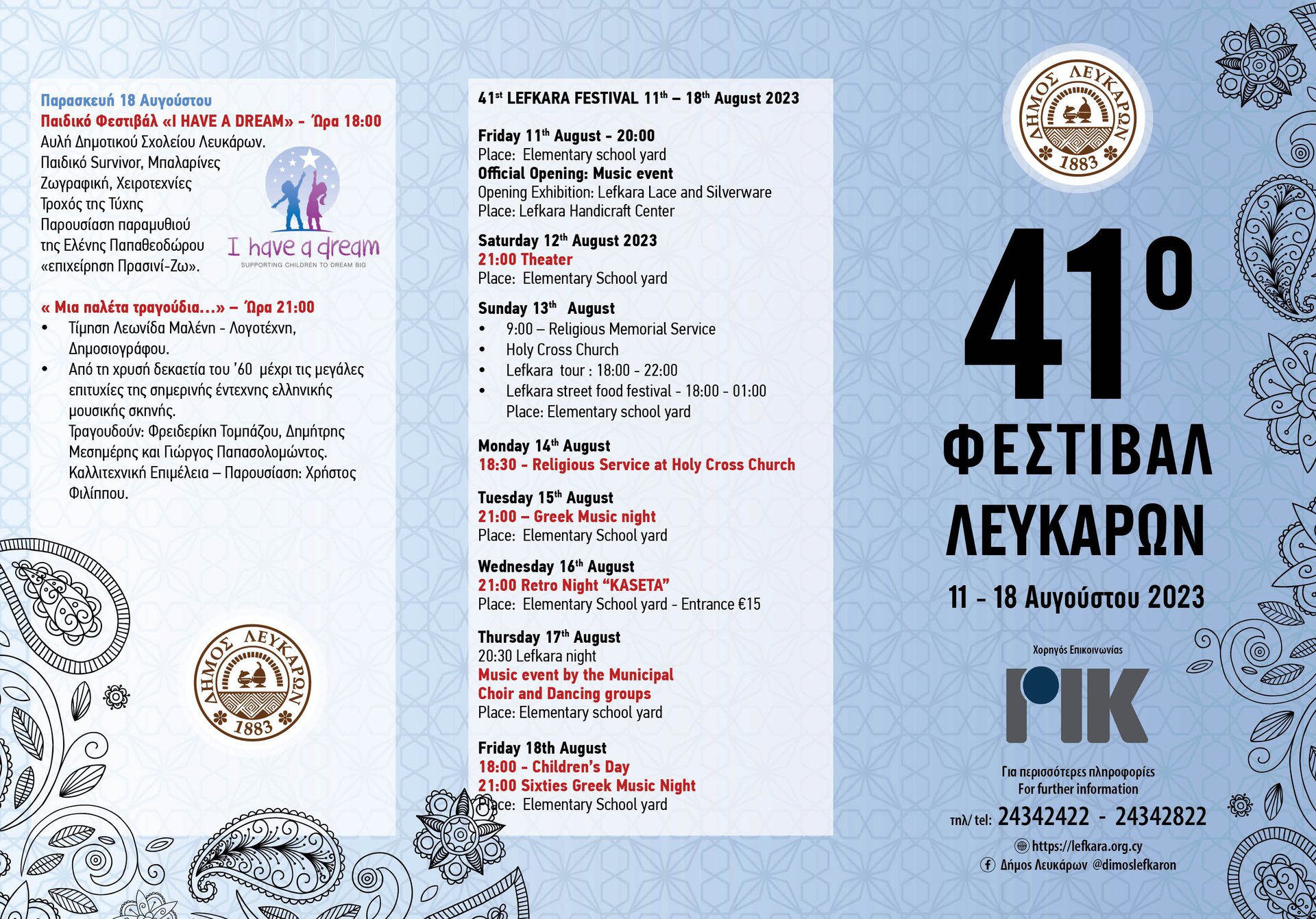 Ο Δήμος Λευκάρων διοργανώνει το 41ο Φεστιβάλ Λευκάρων και μας προσκαλεί σε 8 ημέρες γεμάτες. Από τις 11 μέχρι τις 18 Αυγούστου πάμε στο διάσημο χωριό της επαρχίας Λάρνακας για ψυχαγωγία για όλα τα γούστα.