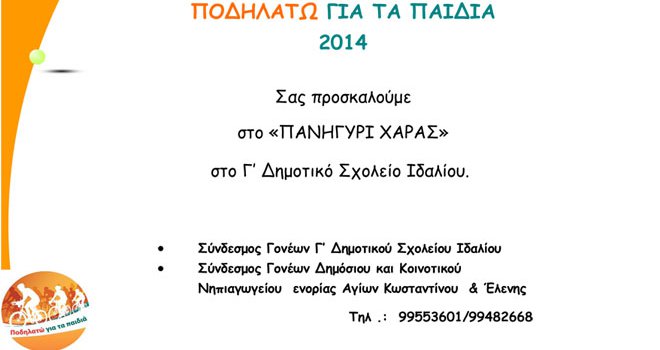 Ο Σύνδεσμος Γονέων του Γ’ Δημοτικού Σχολείου Ιδαλίου και ο Σύνδεσμος Γονέων του Δημόσιου και Κοινοτικού Νηπιαγωγείου ενορίας Αγίων Κωνσταντίνου & Ελένης διοργανώνουν πανηγύρι χαράς, με σύνθημα "Ποδηλατώ για τα παιδια". Το πανηγύρι θα πραγματοποιηθεί την Κυριακή 6 Απριλίου, στο Γ’ Δημοτικό Σχολείο Ιδαλίου, στις 15.00. Για περισσότερες πληροφορίες, τηλέφωνα 99553601, 99482668.
