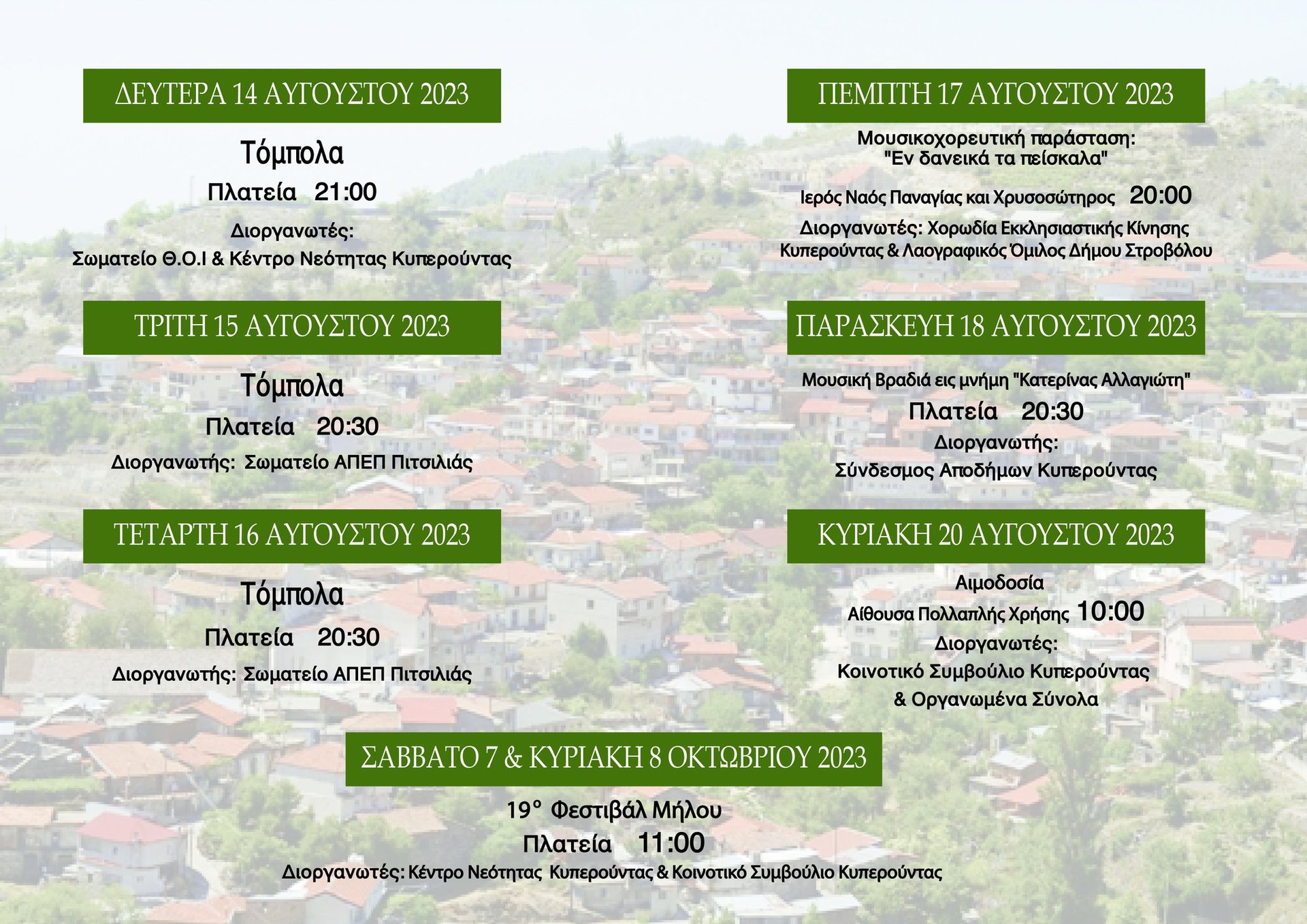 Το πρόγραμμα περιλαμβάνει βραδιές τόμπολας, το Μουσικό Φεστιβάλ Αντίλαλος, Αστρονομική βραδιά, Φεστιβάλ Μήλου και άλλα πολλά.