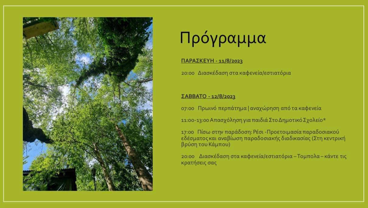 Στο πόγραμμα περιλαμβάνονται μάλιστα δραστηριότητες όπως πρωινό περπάτημα και προετοιμασία παραδοσιακών προϊόντων όπως ρέσι, διασκέδαση στα καφενεία, τόμπολα, μουσικές βραδιές με το μουσικό σχήμα της Βασιλικής Χατζηαδάμου κ.ά.