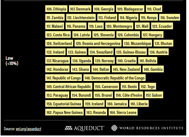 Οι 25 χώρες με το μεγαλύτερο στρες στο νερό είναι: Μπαχρέιν, Κύπρος, Κουβέιτ, Λίβανος, Ομάν, Κατάρ, Ηνωμένα Αραβικά Εμιράτα, Σαουδική Αραβία, Ισραήλ, Αίγυπτος, Λιβύη, Υεμένη, Μποτσουάνα, Ιράν, Ιορδανία, Χιλή, Σαν Μαρίνο, Βέλγιο, Ελλάδα , Τυνησία, Ναμίμπια, Νότια Αφρική, Ιράκ, Ινδία και Συρία.