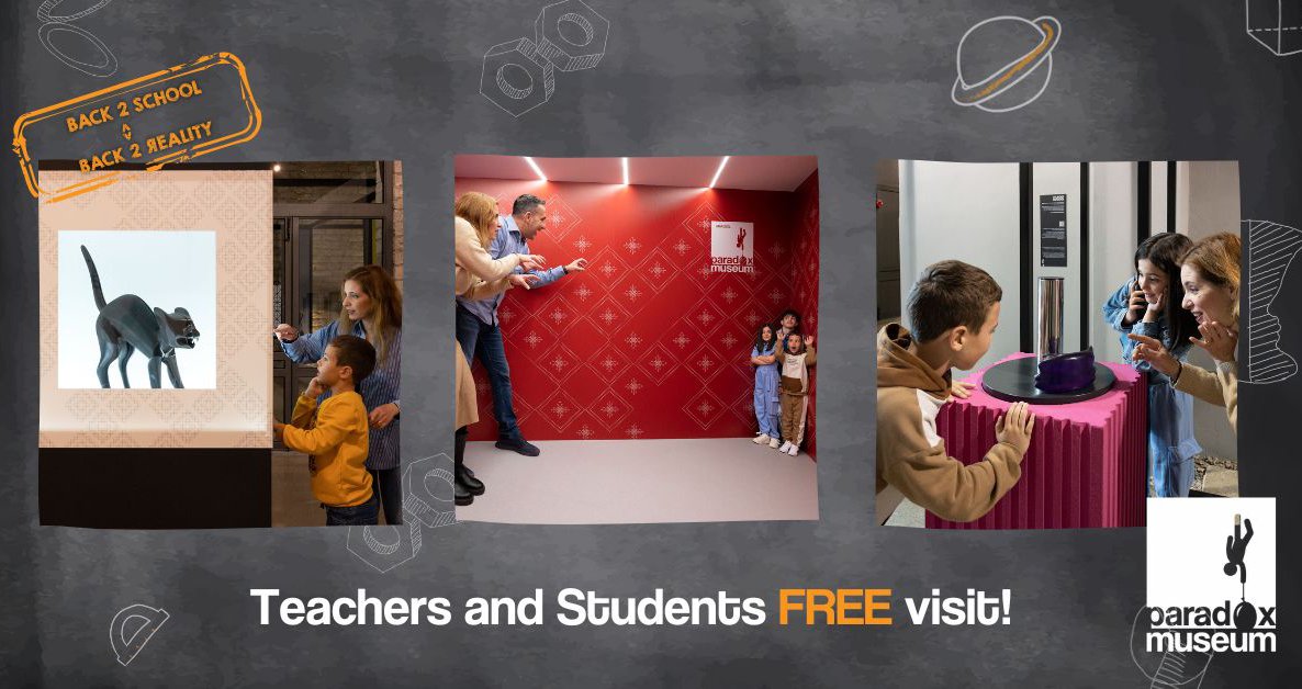 Στο Paradox Museum Limassol ο Σεπτέμβριος είναι ο Μήνας Εκτίμησης Εκπαιδευτικών! Θέλοντας να εκφράσουμε τη θερμή μας εκτίμηση σε όλους τους αφοσιωμένους εκπαιδευτικούς, ως ένδειξη ευγνωμοσύνης, προσφέρουμε δωρεάν είσοδο σε αυτούς, κατά τη διάρκεια όλου του μήνα, κάθε Δευτέρα, Τρίτη και Τετάρτη. Εξερευνήστε τα εκθέματά μας, εμπνευστείτε και ανακαλύψτε νέους τρόπους για να παρακινήσετε τους μαθητές σας. Επιπλέον, με την ευκαιρία αυτή, αποκλειστικά για δύο εβδομάδες, από την 1η έως τις 14 Σεπτεμβρίου, από Δευτέρα έως Τετάρτη, όλοι οι μαθητές έως 12 ετών καλούνται να ζήσουν την εμπειρία του Paradox Museum Limassol εντελώς δωρεάν.