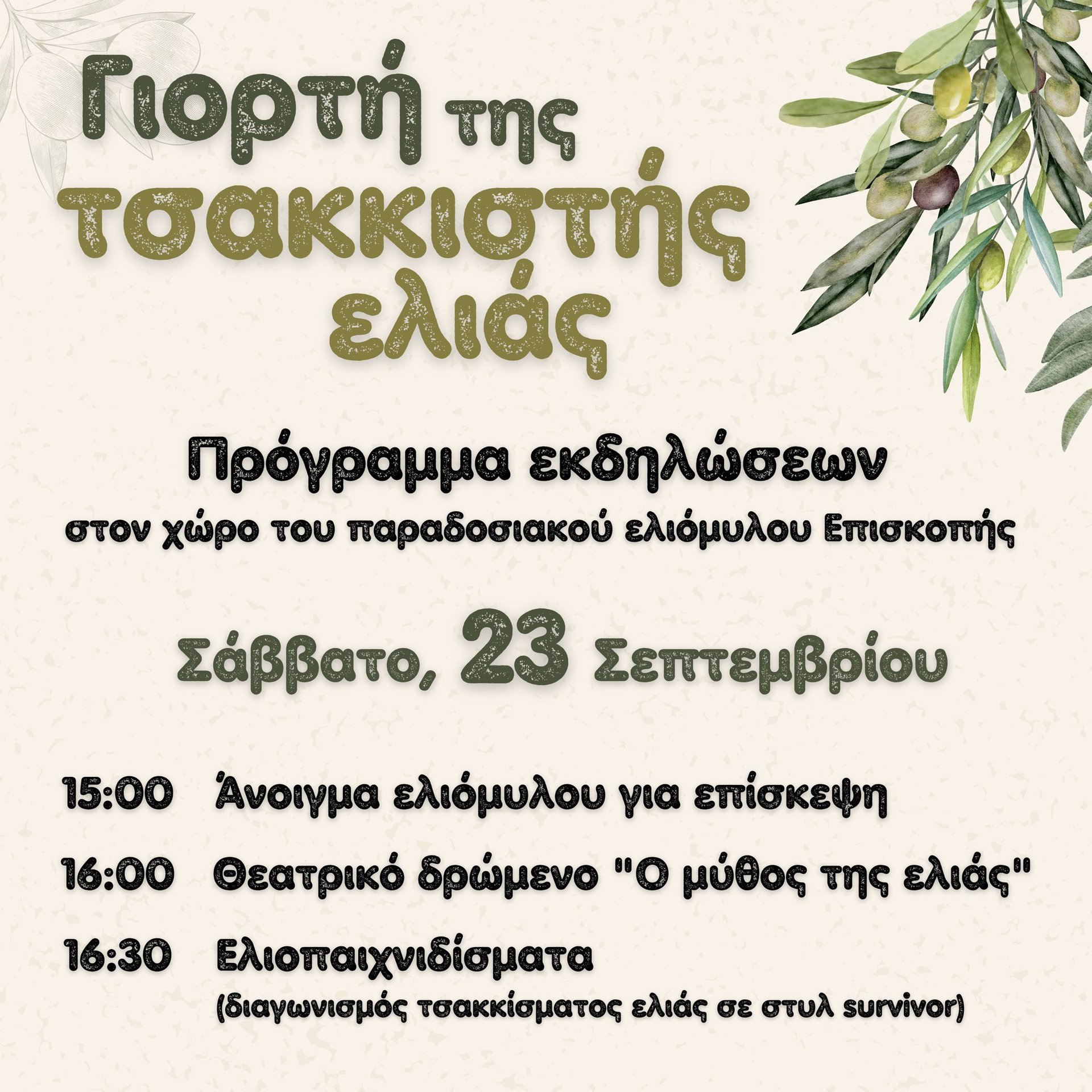 Για 5η συνεχόμενη χρόνια, έρχεται η Γιορτή της Τσακκιστής Ελιάς στην Επισκοπή.