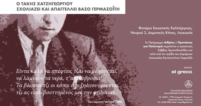 Το Φυτώριο Εικαστικής Καλλιέργειας φιλοξενεί την ομιλία του Τάκη Χατζηγεωργίου για το λαϊκό ποιητή Βάσο Γερμασοΐτη. Η εκδήλωση εντάσσεται στο πλαίσιο του προγράμματος "Αιθρίες - Προτάσεις για Πολιτισμό" που επιμελείται ο εικαστικός Σάββας Χριστοδουλίδης και τελεί υπό την αιγίδα του Δημάρχου Λευκωσίας, Κωνσταντίνου Γιωρκάτζη.