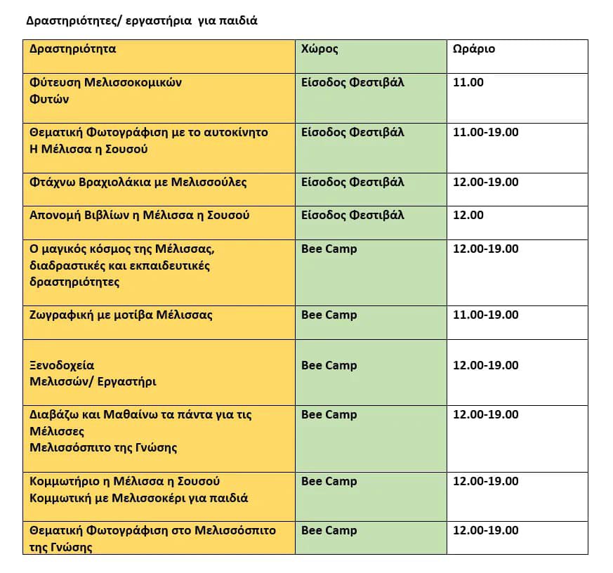 Η γιορτή θα περιλαμβάνει δημιουργικά εργαστήρια, παραμύθια, τραγούδια, γεύσεις και αρώματα, μουσική και δημιουργία ξενοδοχείων μελισσών, χειροποίητων καλλυντικών από μελισσοκέρι για παιδιά, κατασκευών με ανακυκλώσιμα υλικά, μπόλικο μέλι από τους μελισσοκόμους της περιοχής, γαστρονομία με μέλι και 30 εκθέτες!