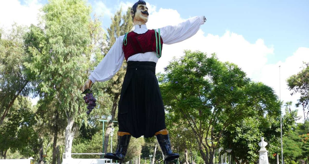Η επτά μέτρων επιβλητική μορφή του βρακοφόρου αμπελουργού, ο οποίος στο ένα του χέρι κρατά το τσαμπί και στο άλλο το παραδοσιακό «κολότζι» με το κρασί, πήρε τη θέση της, το πρωί, υπό τους ήχους τραγουδιών του κρασιού, από τους κανταδόρους «Αρίωνες» και στην παρουσία μελών του Δημοτικού Συμβουλίου.