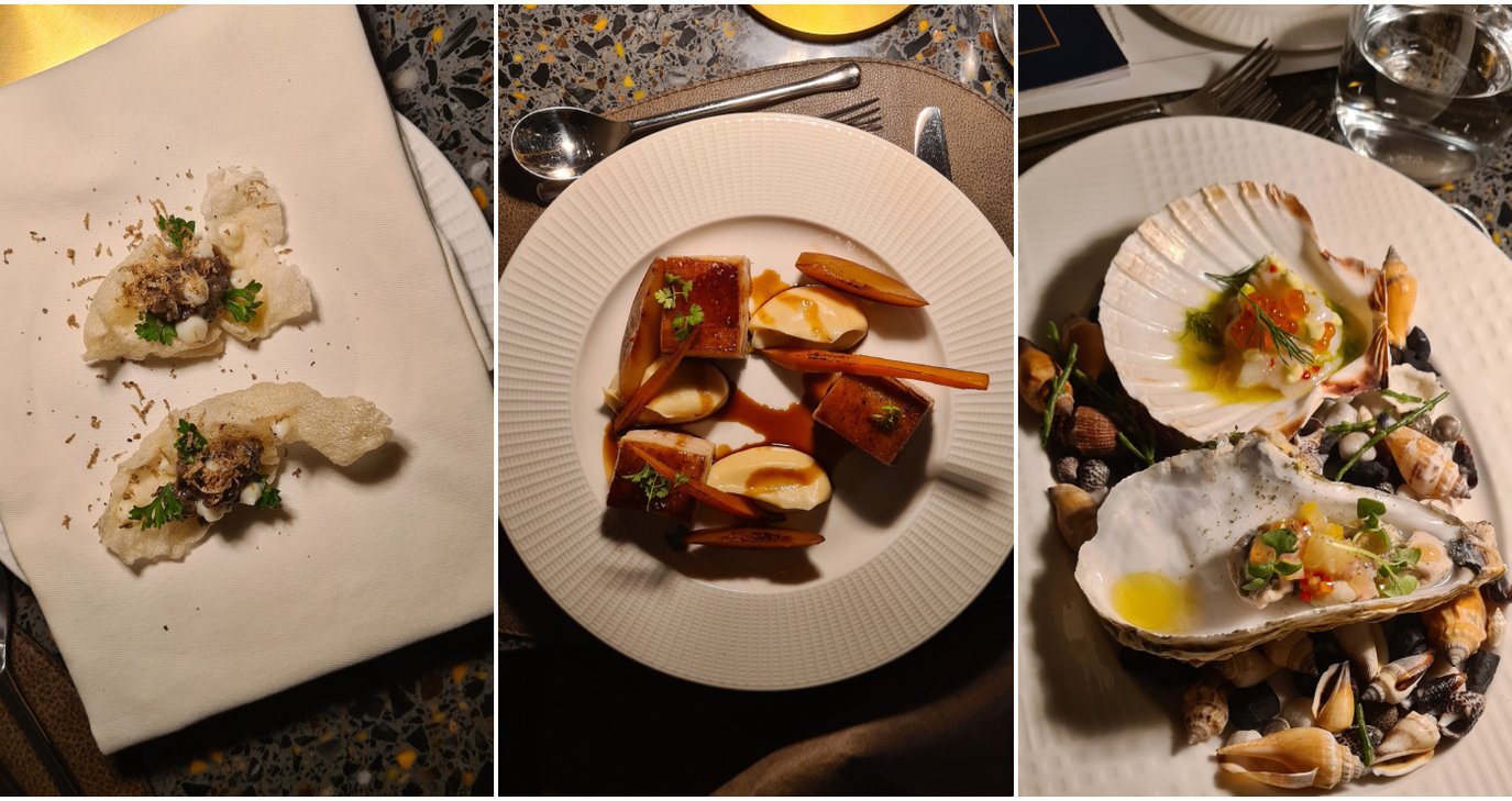 Το ορεκτικό που ακολούθησε ήταν ελκυστικό στο μάτι και στη γεύση, δροσερό, ισορροπημένο και με τη σωστή οξύτητα. Φρέσκο στρείδι και χτένι με νότες λεμονιού και εσπεριδοειδών, απαλή κρέμα μάραθου και αυγά από πέστροφα.