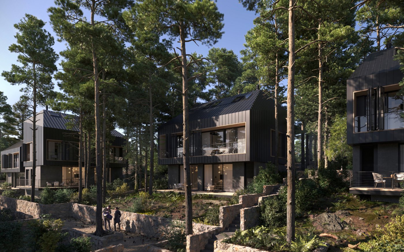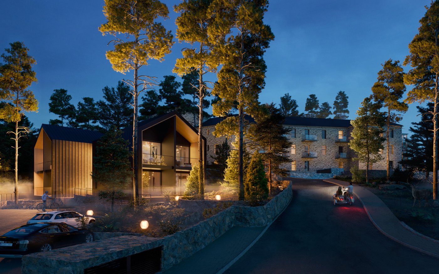 Στην εξωτερική όψη του κτιρίου θα κυριαρχεί η γκρίζα πέτρα, τα παράθυρα θα διατηρήσουν την αρχική τους μορφή, και η στέγη θα χτιστεί ξανά. Οι χαρακτηριστικοί ακρινοί πύργοι και ο κυρίαρχος πύργος πάνω από την είσοδο θα συντηρηθούν, με το ξύλο και την πέτρα να πρωταγωνιστούν. Ο εξωτερικός χώρος θα διαθέτει πισίνα, άνετους καθιστικούς χώρους, χώρο προγεύματος και μπαρ, και όλα αυτά, με την εκπληκτική θέα του δάσους.