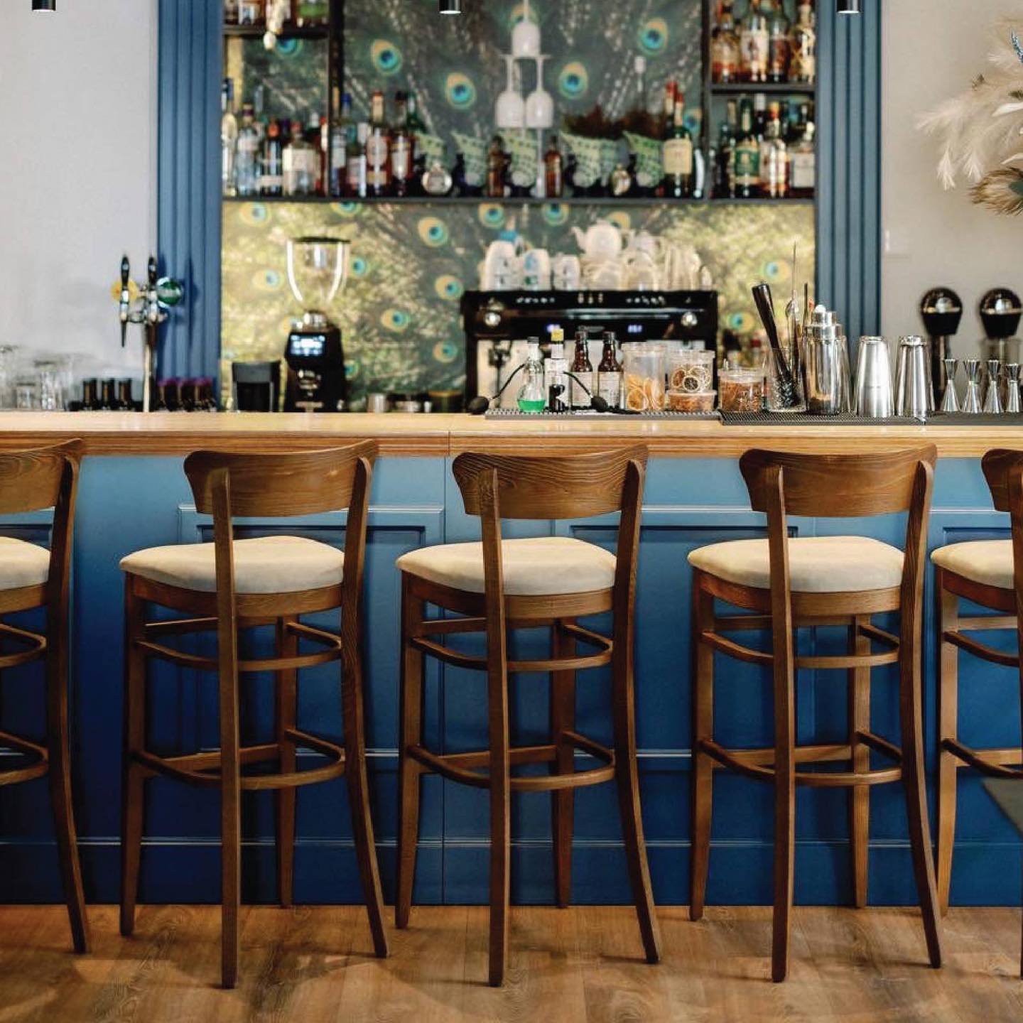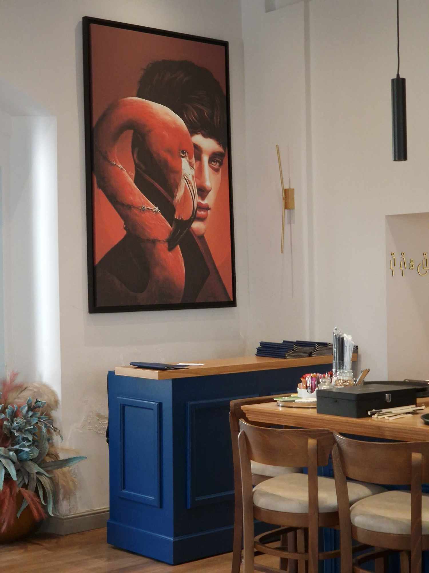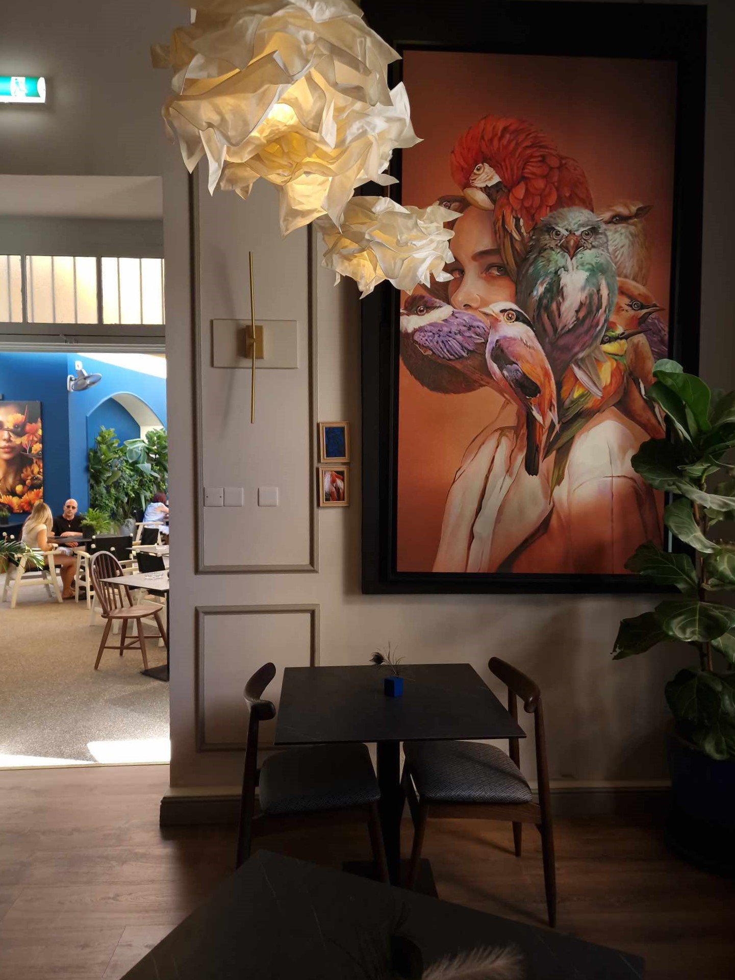 Το Dimora στεγάζεται σε ένα αρχοντικό, αυτή άλλωστε είναι και η έννοια της λέξης στα ιταλικά. Μια αυλή με μπόλικο πράσινο χάρη στα φυτά που περιλαμβάνει, και έντονο μπλε στους τοίχους, γίνεται ένας όμορφος, δροσερός προορισμός για να απολαύσεις brunch. Ο εσωτερικός του χώρος εξίσου ενδιαφέροντας, με τα ιδιαίτερα λευκά φωτιστικά σαν λουλούδι, τα αψιδωτά ράφια με μοτίβο τα φτερά παγωνιού πίσω από το μπαρ και τα πουλιά, γενικότερα, να πρωταγωνιστούν σε μεγάλους και μικρούς πίνακες που ελκύουν το μάτι και δεν μπορείς παρά να παρατηρήσεις (και να φωτογραφίσεις).