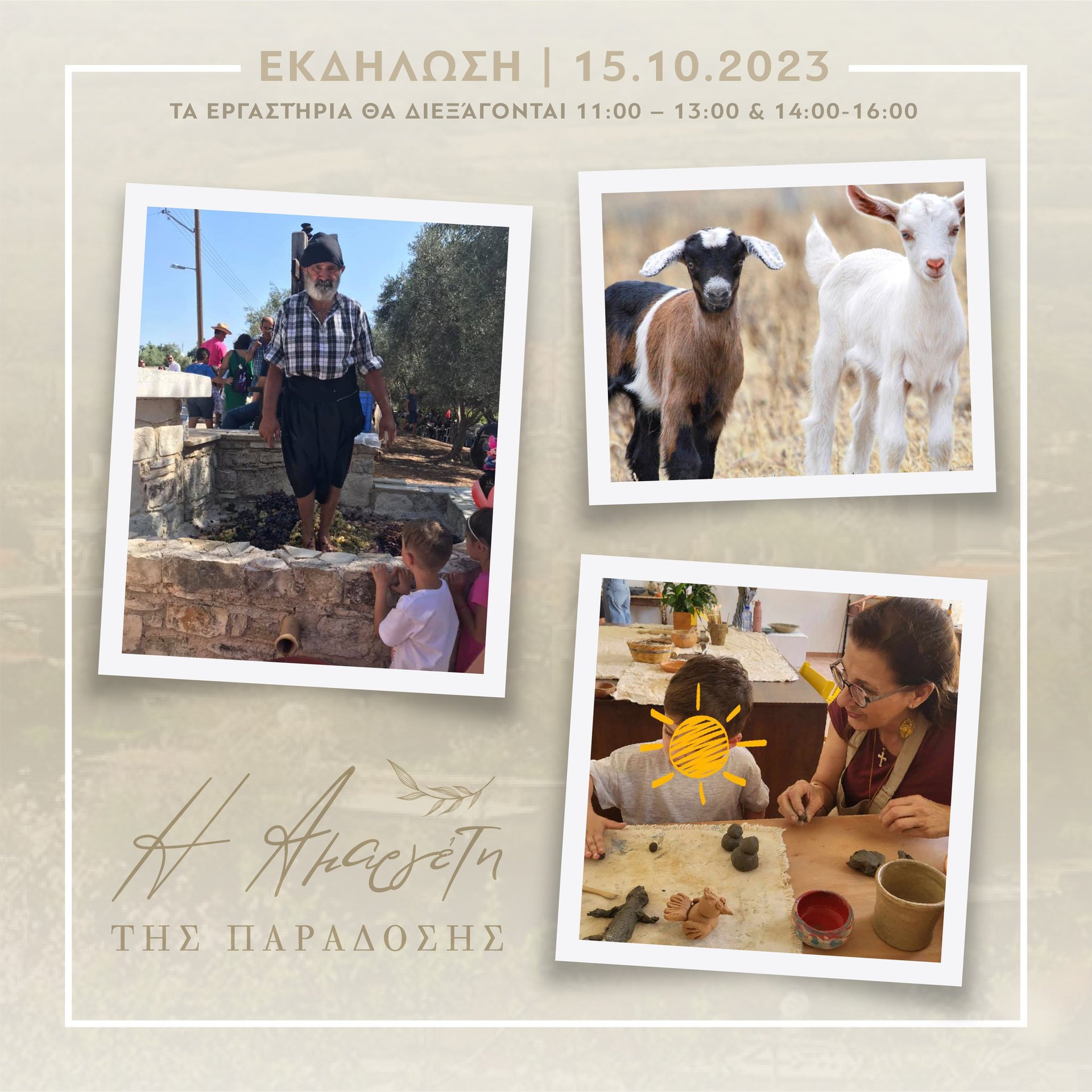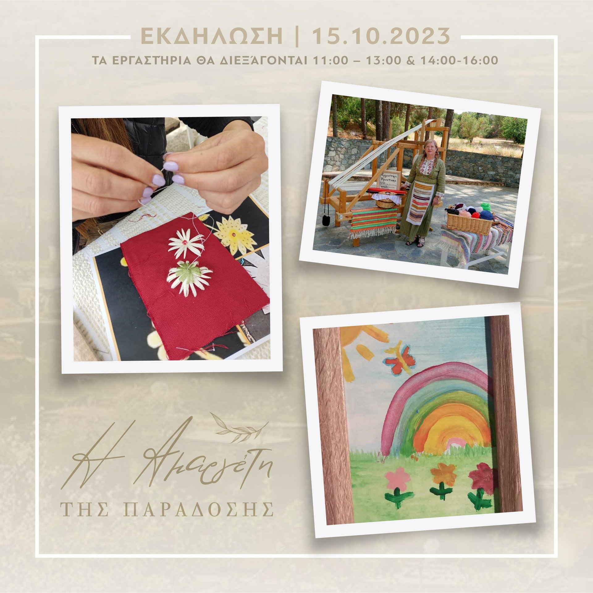 - Επισκέψιμα βιωματικά εργαστήρια οινογαστρονομίας και χειροτεχνίας. Ψυχαγωγία του κοινού και ενεργή εμπλοκή του. Θα υπάρχουν εργαστήρια Μεταξιού, Υφαντικής, Αγγειοπλαστικής, Ζωγραφικής, Ψαθοπλεκτικής, Κεντήματα. Όπου και θα δίνεται η ευκαιρία στους παρευρισκόμενους να συμμετέχουν και να λαμβάνουν μέρος στα εργαστήρια.