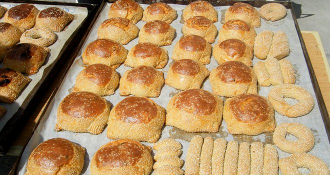 τα ζυμωτά μου κουλούρια-, τυρί αιγινό από το Αγρόκτημα Σταλιές (Επωνυμία "Το Ανωυρκάτικο", τηλ. 99433287), σταφίδες, μαχλέπι και μαστίχα τα βασικά μου συστατικά. Άμα πυρώσει ο ξυλόφουρνος, τις ρίχνω μέσα σε μέτρια θερμοκρασία και σε κανένα μισαωράκι μαζευόμαστε όλοι για να τις απολαύσουμε ζεστές. Αν τουναντίον με πλακώσουν οι δουλειές, πετάγομαι στο γειτονικό φούρνο "Ζορμπάς" και αγοράζω καμιά δεκαριά από τις εξαίρετές τους παραδοσιακές φλαούνες.