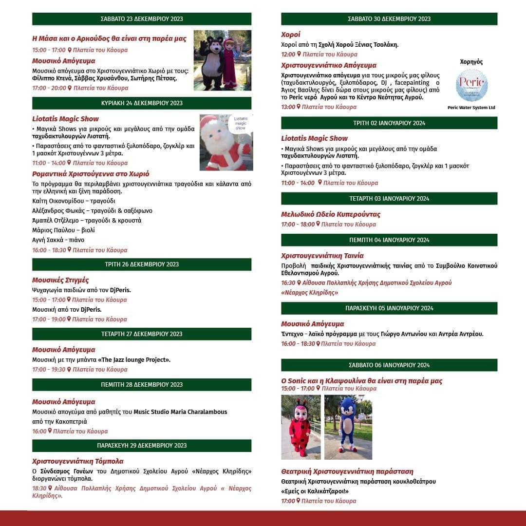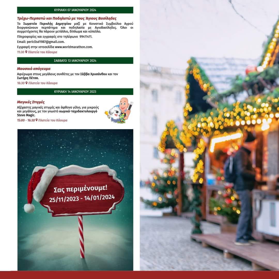 Στις 25 Νοεμβρίου γίνεται η αρχή, με τον στολισμό του δέντρου στην Πλατεία του Κάουρα. Στις μέρες που θα ακολουθήσουν θα μπορούμε να απολαύσουμε magic show, θεατρικές παραστάσεις, χορούς, χειροτεχνίες, μουσικό πρόγραμμα και θα έχουμε αγαπημένες μασκότ στην παρέα μας.