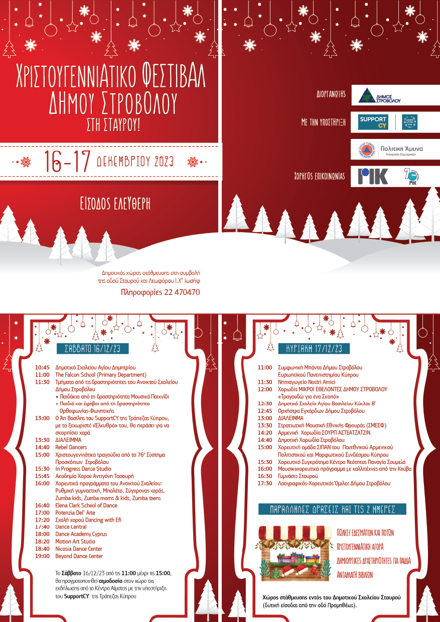 Ο Δήμος Στροβόλου προσκαλεί μικρούς και μεγάλους στο Χριστουγεννιάτικο Φεστιβάλ που θα πραγματοποιηθεί στη Σταυρού το Σαββατοκύριακο 16 και 17/12/23!