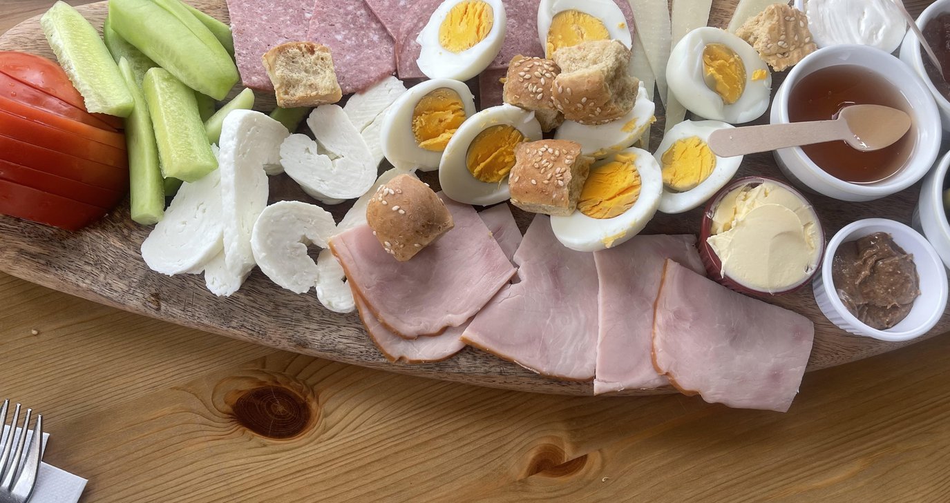 Ένα πλάτερ με επιλογές όπως ελιές τσακκιστές, χαλούμι, αυγά, λούντζα, κεφαλοτύρι, φυστικοβούτυρο, μαρμελάδα κ.ά.