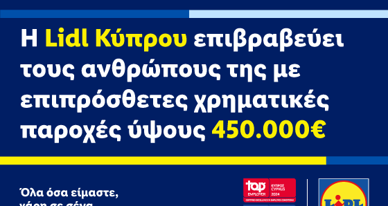 Η Lidl Κύπρου επιβραβεύει τη συλλογική προσπάθεια και συνεισφορά της ομάδας της, προχωρώντας στη χορήγηση επιπρόσθετων χρηματικών παροχών συνολικού ύψους 450.000€.