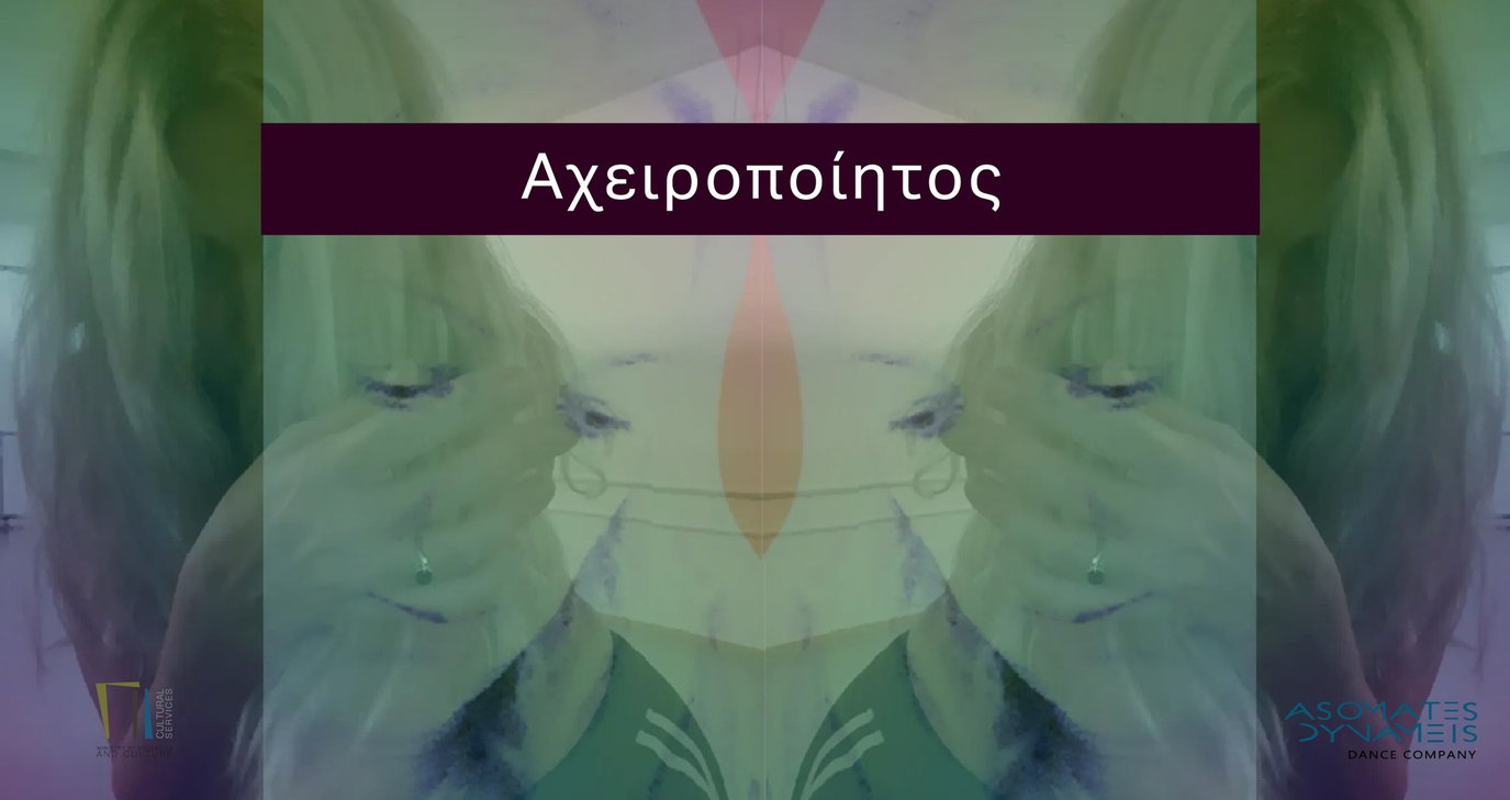 Στην παράσταση «Αχειροποίητος» μια γυναίκα έρχεται να αφηγηθεί με το ώριμο πιά σώμα της, τον λόγο και την κίνηση, όψεις που συγκροτούν την ταυτότητα της θηλυκότητας όπως αυτές καταγράφονται στο σώμα και στην γυναικεία συνειδητότητα, κι όπως εκφράζονται μέσα από τις αρχετυπικές μορφές της Παναγίας και της Αφροδίτης.