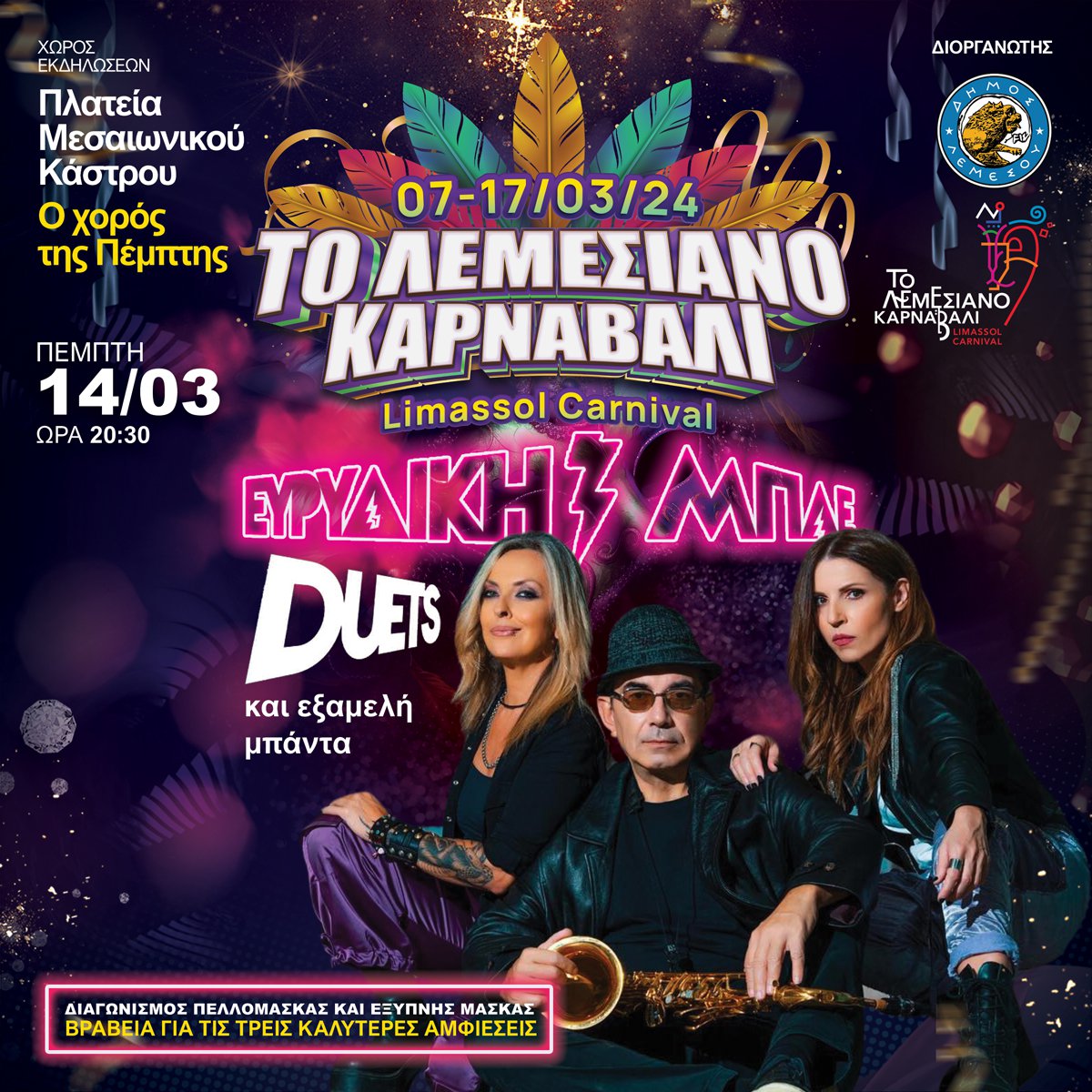 Ο Δήμος Λεμεσού σας προσκαλεί στο μεγάλο χορό της Πέμπτης για να τραγουδήσουμε και να χορέψουμε παρέα με το σχήμα Ευρυδίκη- Μπλε Duets και εξαμελή μπάντα. Ένα πρόγραμμα με ελληνικά και αγγλικά τραγούδια, εκρηκτικό, γεμάτο ρυθμό, ένταση και ηλεκτρισμό με ντουέτα έκπληξη και φυσικά μεγάλες επιτυχίες. Το καρναβαλίστικο ξεφάντωμα συνεχίζεται με μουσική και χορό από τον DJ Bereck.