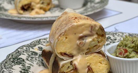 Τραγανή τορτίγια με ομελέτα, τυρί τσένταρ, μπέικον, χας μπράουν, σπιτική σάλτσα τυριού, σερβιρισμένη με λαχταριστό γκουακαμόλε.