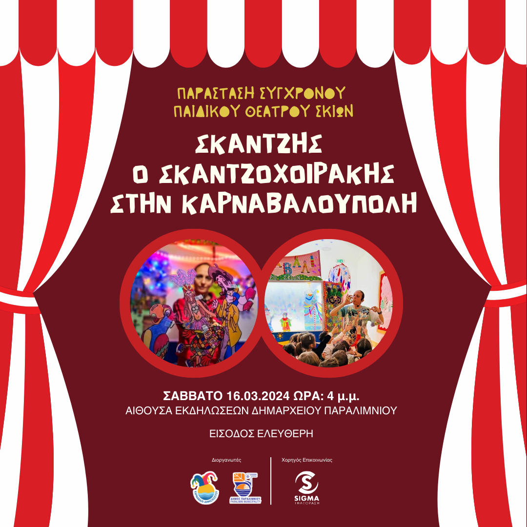 Στις 4 το απόγευμα στην αίθουσα εκδηλώσεων του Δημαρχείου Παραλιμνίου θα πραγματοποιηθεί η παιδική παράσταση του Σύγχρονου Θεάτρου Σκιών «Σκάντζης ο Σκαντζοχοιράκης στην Καρναβαλούπολη». Η είσοδος είναι δωρεάν.