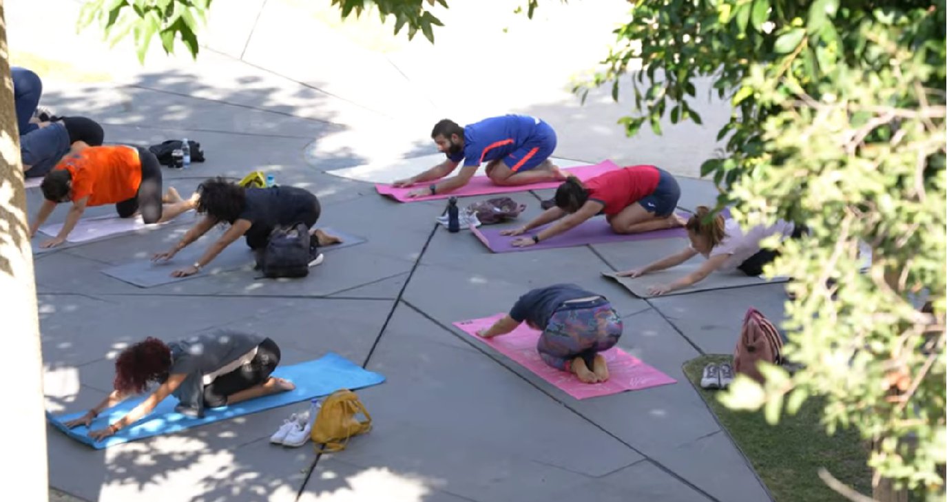 Συγκεκριμένα, τα μαθήματα Yoga προσφέρονται από τις 8:30 μέχρι τις 9:30 το πρωί, δίπλα από το Αμφιθέατρο της Πλατείας Ελευθερίας.