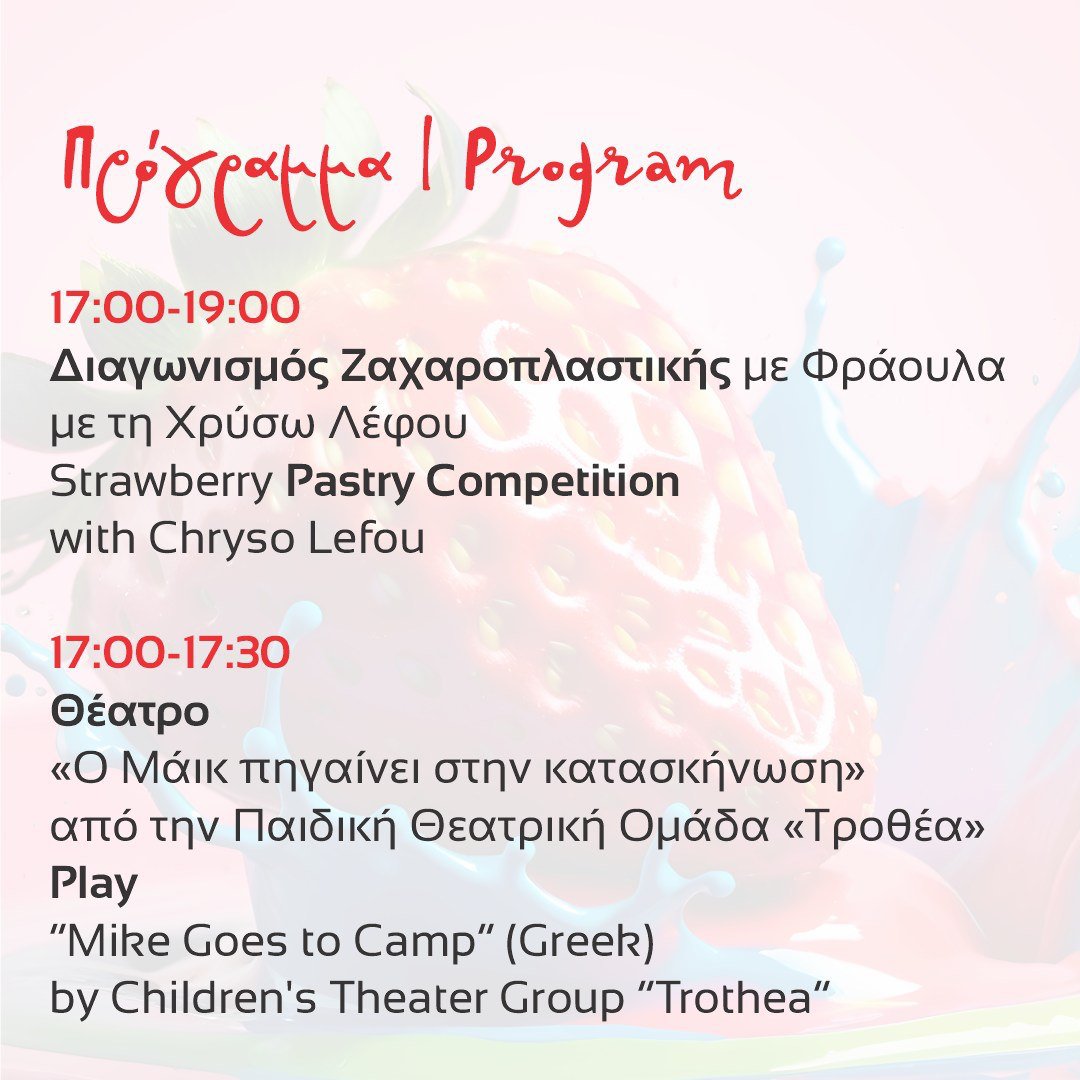 Μασκότ φράουλας, παιδικό θέατρο, αγγειοπλαστική, χειροτεχνίες, face painting, και άλλες πολλές εκπλήξεις μας περιμένουν να τα δούμε από κοντά και να τα απολαύσουμε.