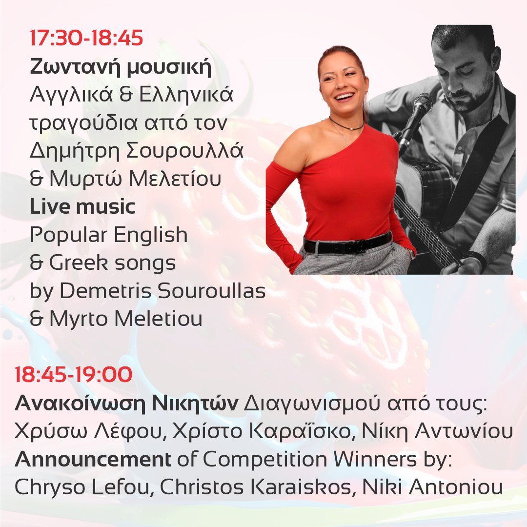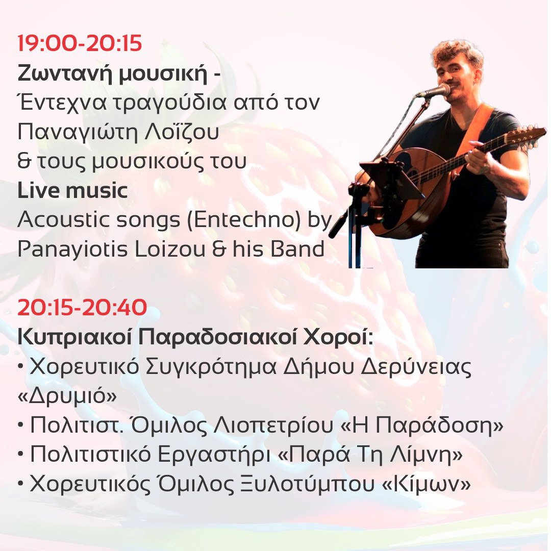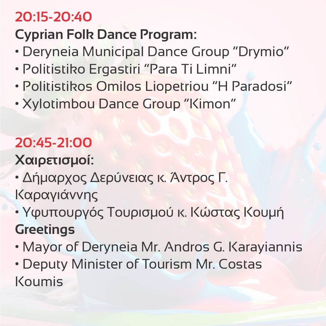 To Φεστιβάλ Φράουλας επιστρέφει για την 13η διοργάνωσή του την Παρασκευή 24 Μαΐου του 2024 στο Γήπεδο “Αναγέννησης” Δερύνειας, με πολλές εκπλήξεις, διαγωνισμό ζαχαροπλαστικής με την Χρύσω Λέφου, συναυλία, και πολλές δραστηριότητες.