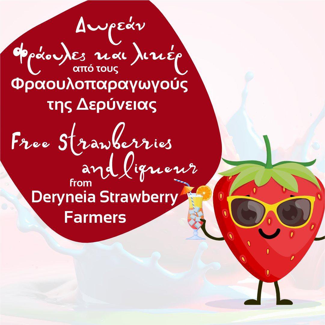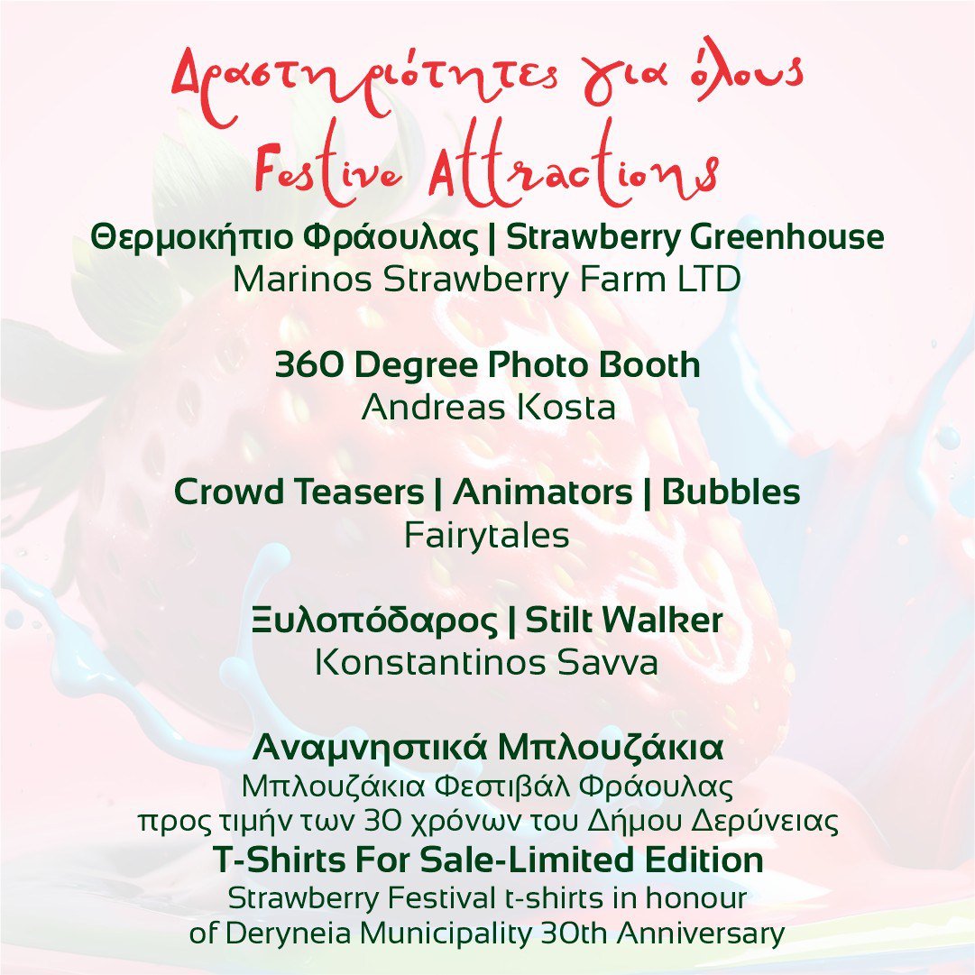 Στoυς επισκέπτες του Φεστιβάλ θα προσφέρονται δωρεάν άφθονες φρέσκες φράουλες και διάφορα παρασκευάσματα της φράουλας όπως χυμός, μαρμελάδα, λικέρ, γλυκά, παγωτά κ.ά.