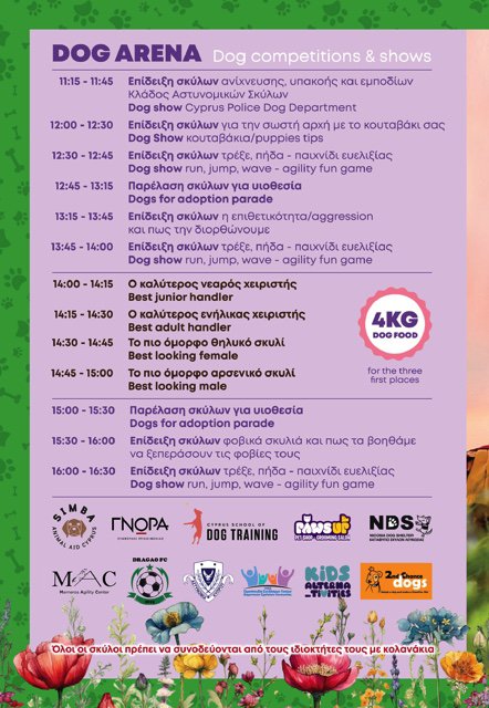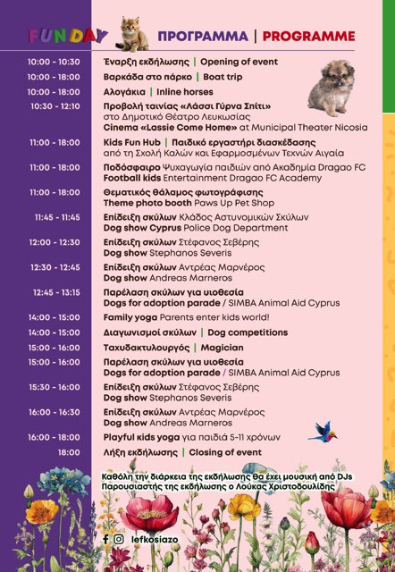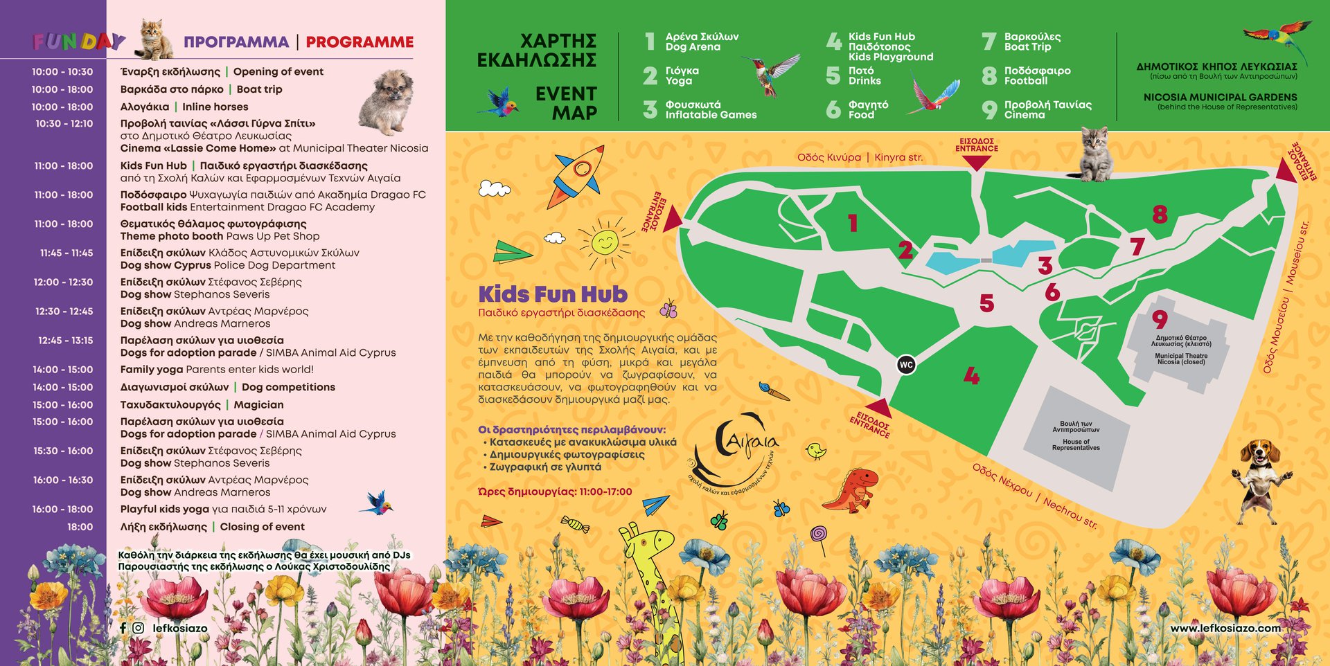Στο χώρο του Δημοτικού Κήπου Λευκωσίας (πίσω από τη Βουλή των Αντιπροσώπων) θα υπάρχουν δραστηριότητες για μικρούς, μεγάλους αλλά και για τα αγαπημένα μας κατοικίδια. Θα περιλαμβάνουν ποδόσφαιρο, βαρκάδα στον κήπο για παιδιά, παιδότοπο, αφήγηση παραμυθιών, φαγητά, ποτά, γιόγκα για μικρούς και μεγάλους, αρένα σκύλων με διαγωνισμούς και επιδείξεις, φουσκωτά παιχνίδια, ταχυδακτυλουργό, photobooth, παρέλαση σκύλων για υιοθεσία, κ.ά.