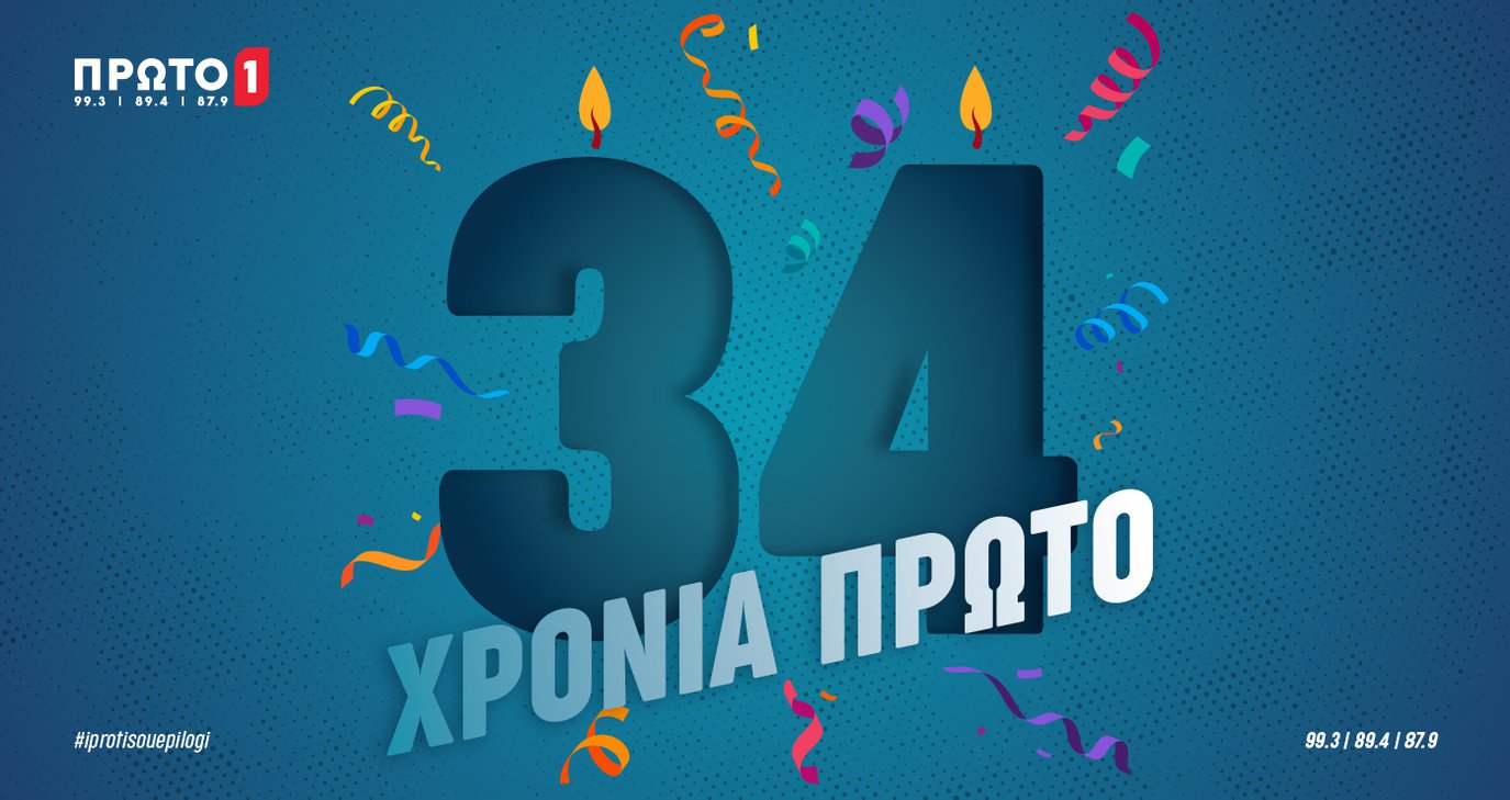 "34 χρόνια 1ο, 34 χρόνια Ράδιο Πρώτο".