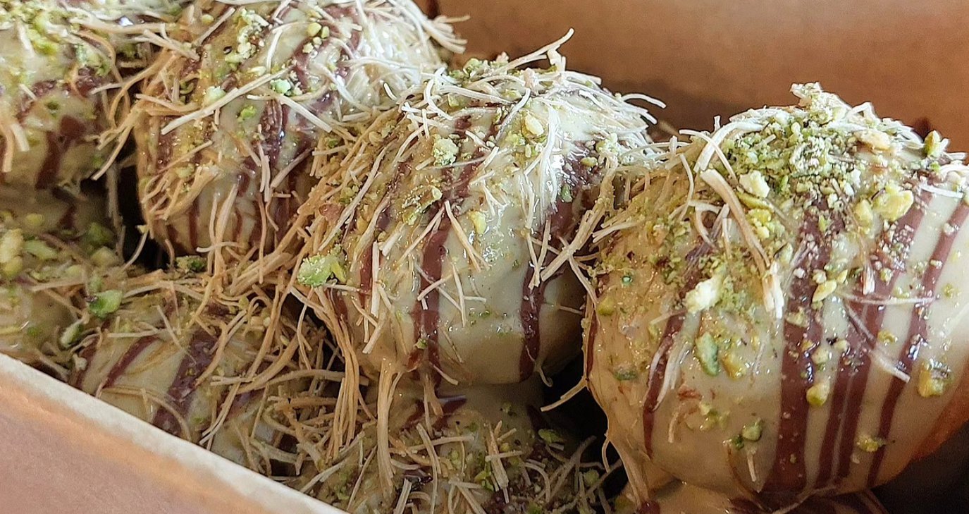Το γνωστό μαγαζί για λουκουμάδες στη Λεμεσό, το LoukouMAN φτιάχνει topping Dubai Chocolate αναμειγνύοντας κανταϊφι, σοκολάτα και κρέμα πιστάτσιο.