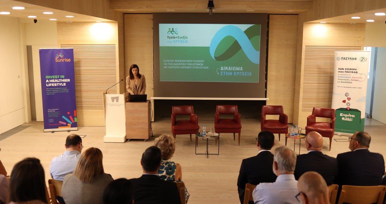 Η Ανώτερη Λειτουργός Πολιτικής του ΠΑΣΥΚΑΦ, κα. Μιράντα Χρυσοστόμου, παρουσίασε το Πρόγραμμα Εταιρικής Κοινωνικής Ευθύνης του ΠΑΣΥΚΑΦ με τίτλο «Υγεία & Ευεξία στην Εργασία: Δικαίωμα στην Εργασία». Το πρόγραμμα στηρίζεται σε τέσσερις πυλώνες: Θέματα Πολιτικής και Στήριξης ατόμων με εμπειρία καρκίνου στον εργασιακό χώρο, Εφαρμογή καλών πρακτικών στο εργασιακό περιβάλλον, Υγεία και Ευεξία στο χώρο εργασίας και Ανάπτυξη του Εθελοντισμού. Ο ΠΑΣΥΚΑΦ, ως Σύνδεσμος Ασθενών, θέτει ως προτεραιότητα τη στήριξη των ατόμων που βιώνουν την εμπειρία του καρκίνου στον χώρο εργασίας και δηλώνει σύμμαχος κάθε μικρής και μεγάλης επιχείρησης, μέσα από το Πρόγραμμα Συμβουλευτικής Υποστήριξης. Ο σκοπός του προγράμματος είναι: α) Να στηρίξει άτομα με εμπειρία καρκίνου και να ενισχύσει την ευεξία τους στο εργασιακό περιβάλλον. β) Να προσφέρει σωστή ενημέρωση και καθοδήγηση στους εργοδότες, παρέχοντας συστάσεις και καλές πρακτικές για την αποτελεσματική υποστήριξη τόσο των εργαζομένων με εμπειρία καρκίνου όσο και του υπόλοιπου προσωπικού. γ) Να ευαισθητοποιήσει την κοινότητα σχετικά με τις προκλήσεις που αντιμετωπίζουν οι εργαζόμενοι με εμπειρία καρκίνου. δ) Να προωθήσει τροποποιήσεις στην εργατική νομοθεσία, θεσπίζοντας πολιτικές σε εθνικό επίπεδο.